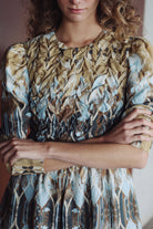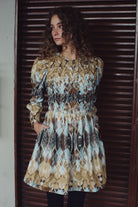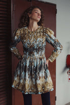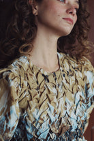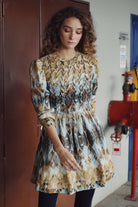 El Vestido Donata es una pieza corta y elegante que destaca por su exclusivo estampado abstracto en tonos azul y marrón, con un aire artístico y sofisticado. Su textura fruncida, trabajada a mano en el cuerpo, aporta volumen y detalle artesanal, realzando la silueta. Presenta mangas largas abullonadas, cuello redondo clásico y prácticos bolsillos laterales, que equilibran estilo y funcionalidad. Esta prenda combina modernidad y comodidad en un diseño versátil.