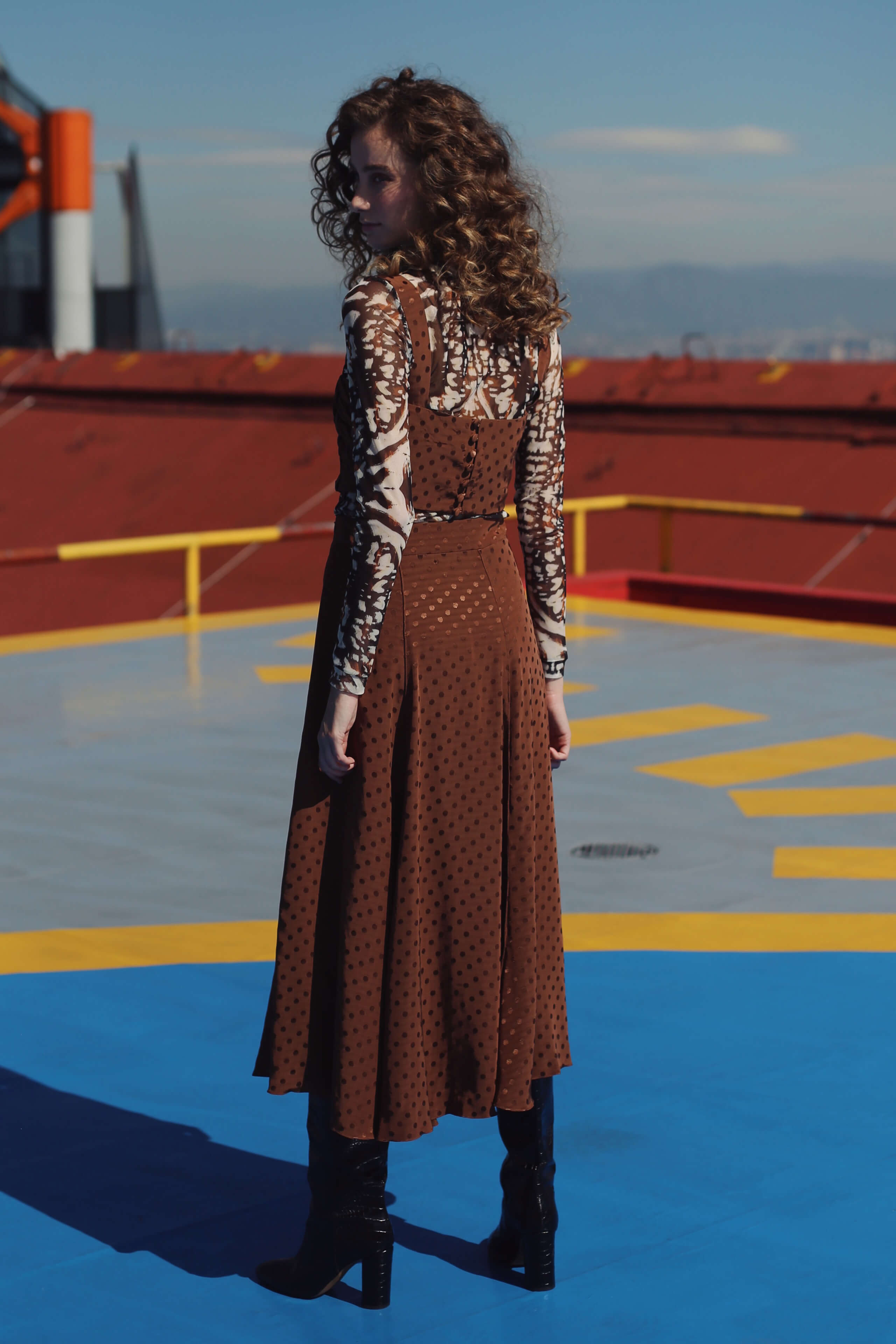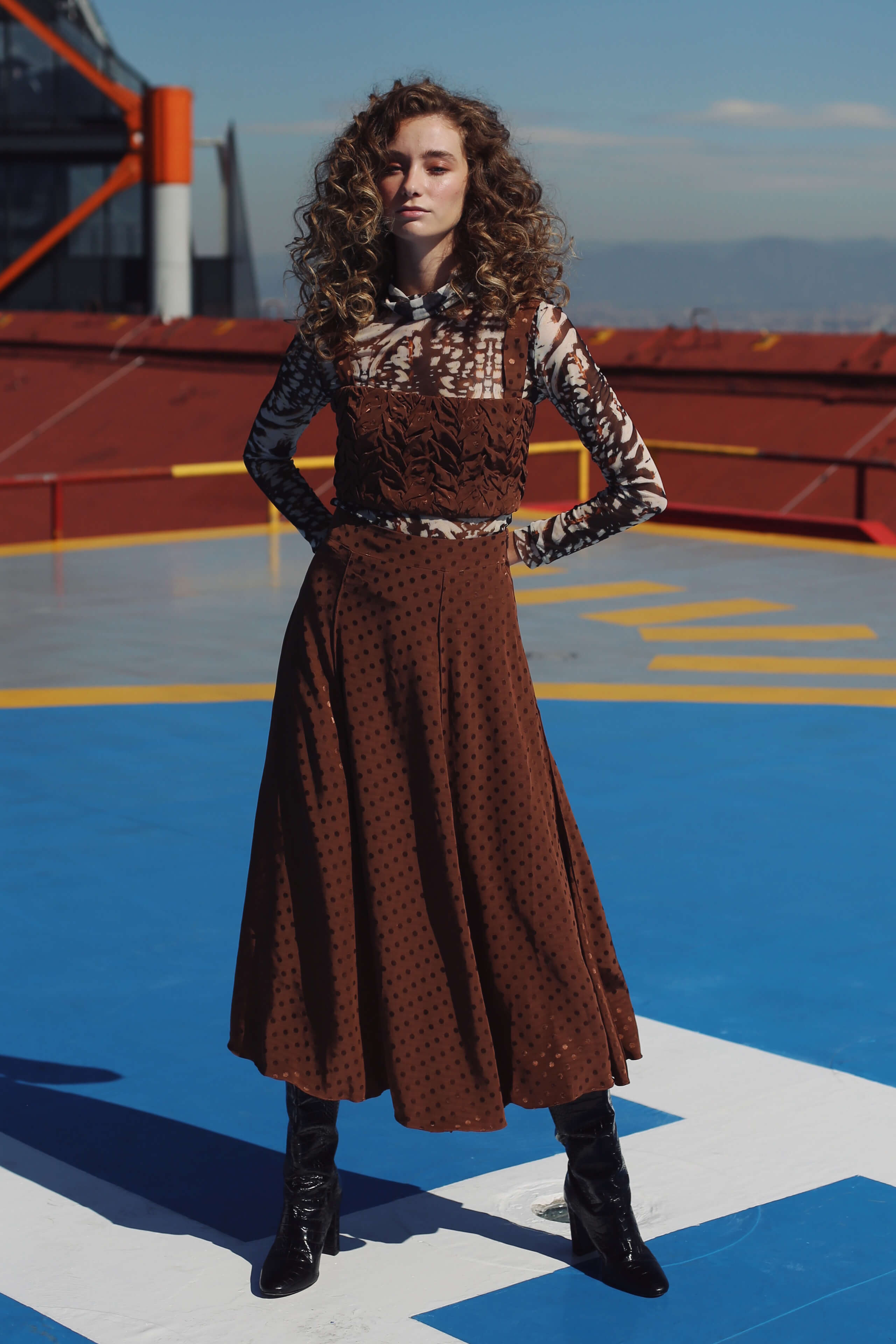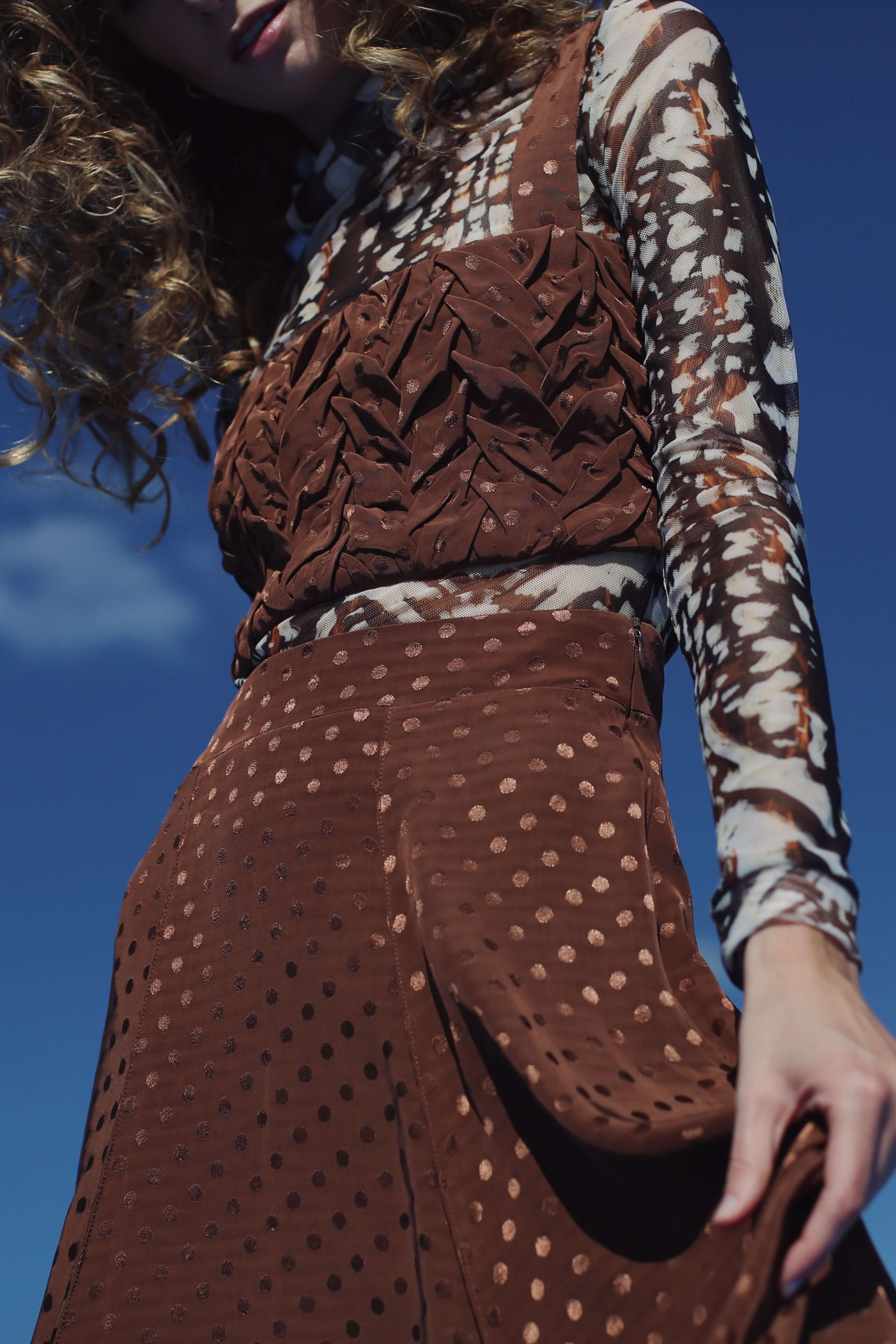 La Falda Desire está confeccionada en un delicado tejido color chocolate con textura de lunares satinados que reflejan la luz con sutileza. Su silueta en “A” y talle alto estilizan la figura, convirtiéndola en una pieza versátil para combinar tanto en looks casuales como sofisticados.