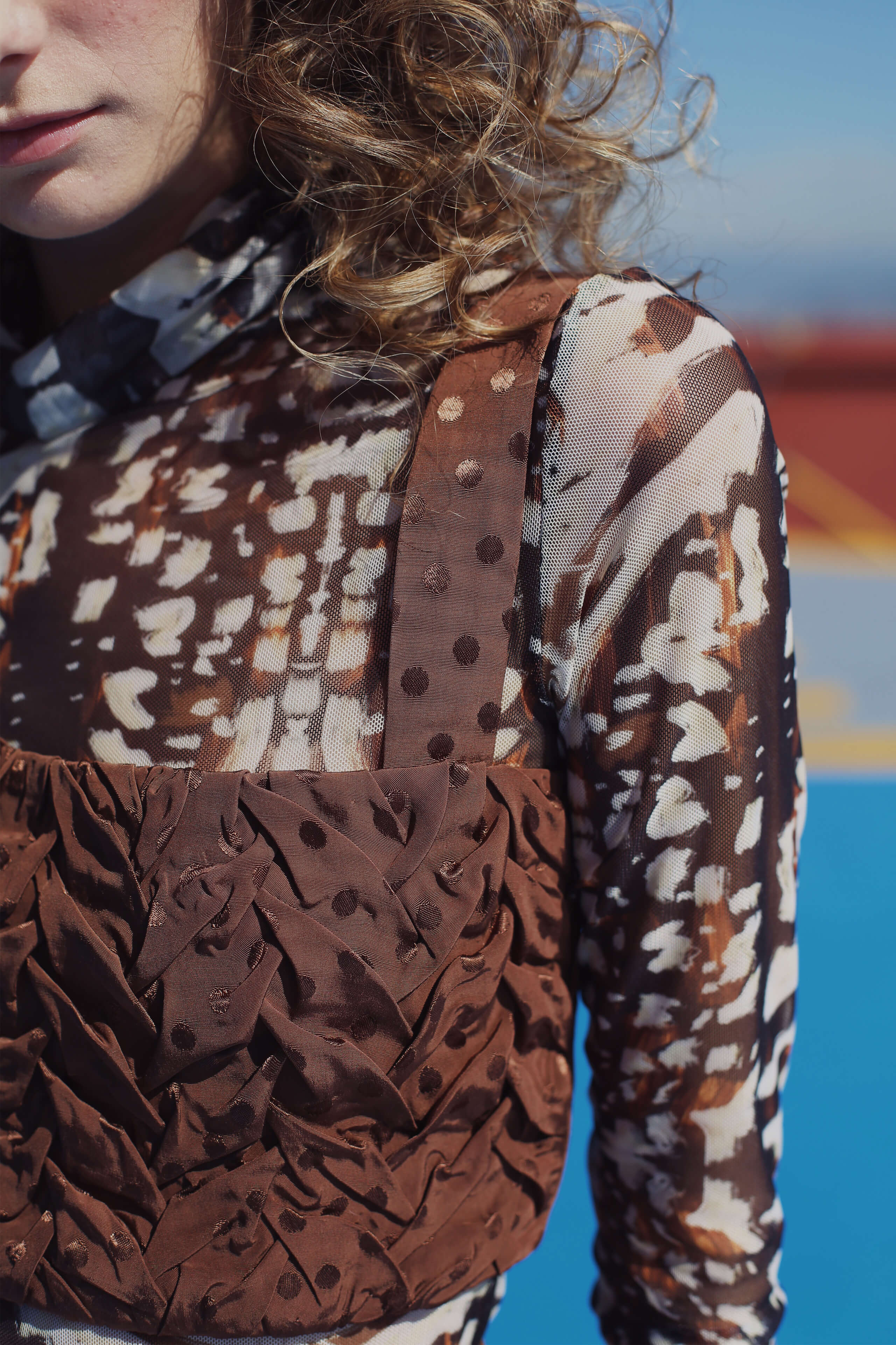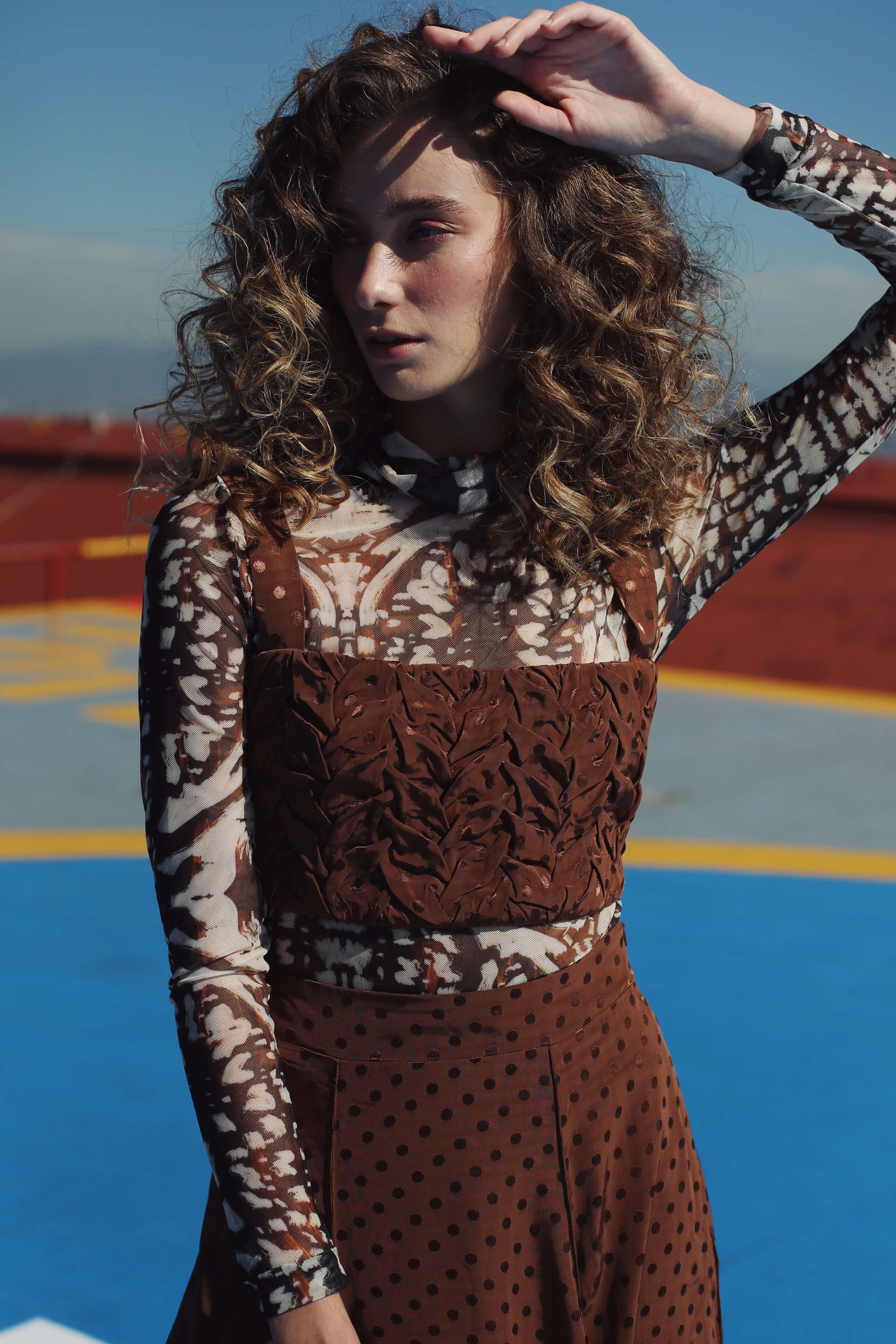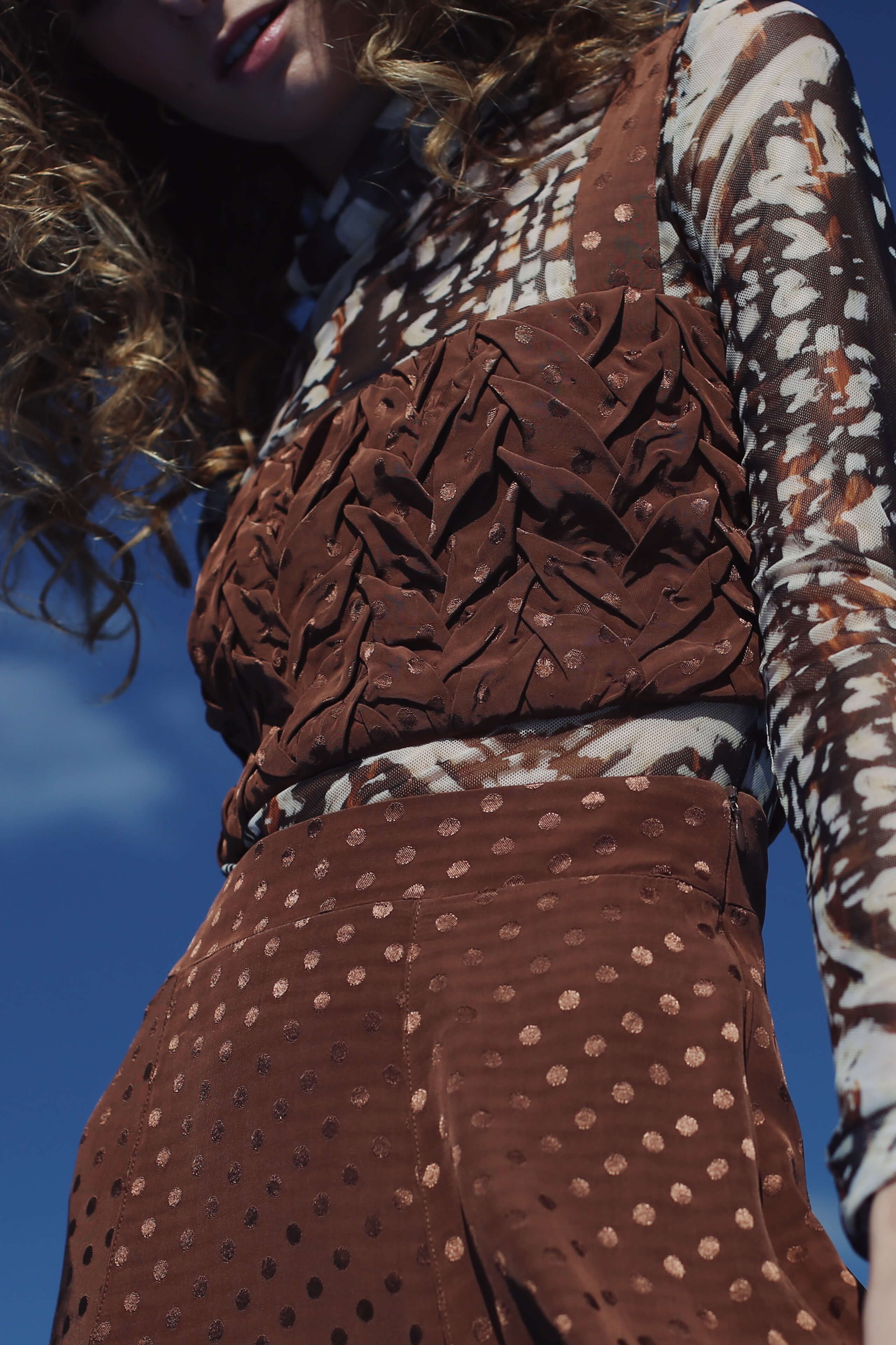 El Top Dalila es una pieza artesanal y única que resalta por su textura fruncida hecha a mano en forma de hojas. Confeccionado en un delicado tejido de rayón y viscosa con sutiles lunares satinados, combina elegancia con un aire moderno. Sus tirantes anchos, escote cuadrado y cierre posterior con botones forrados le otorgan un acabado sofisticado y versátil. Ideal para llevar con faldas de talle alto o pantalones fluidos, es una prenda que aporta carácter y frescura a cualquier look.
