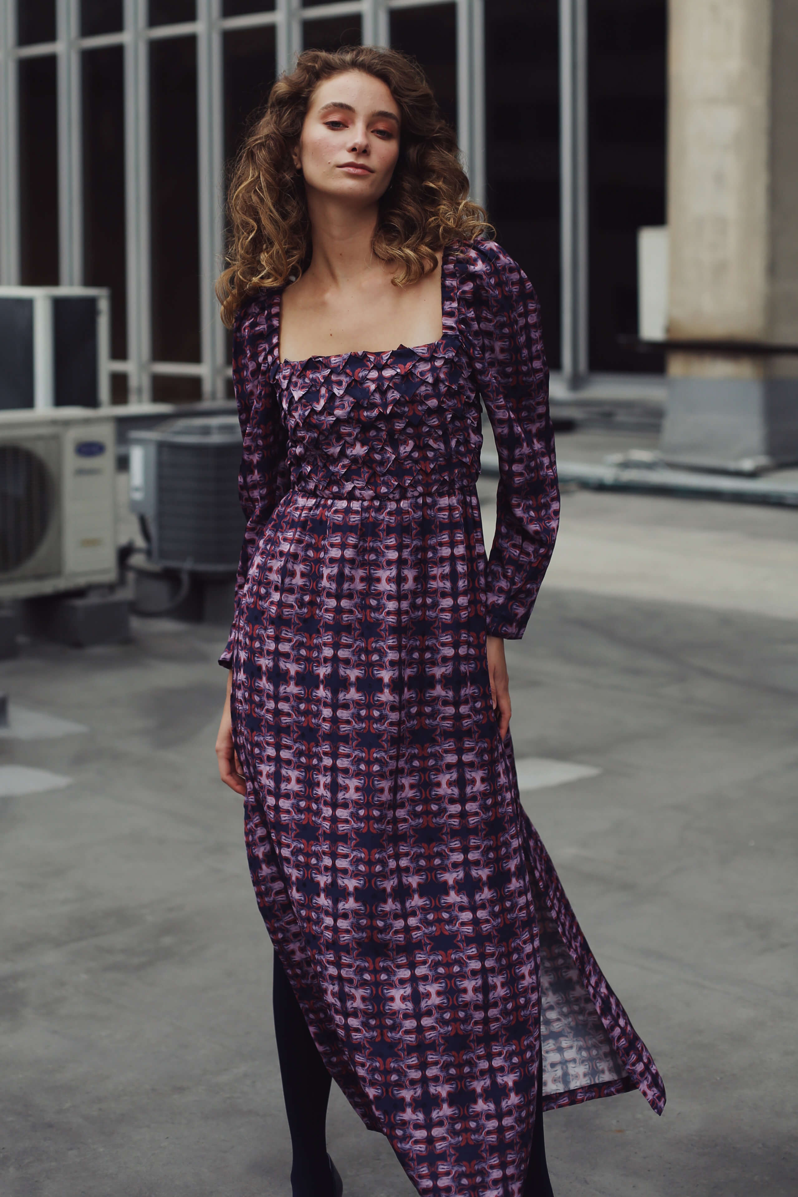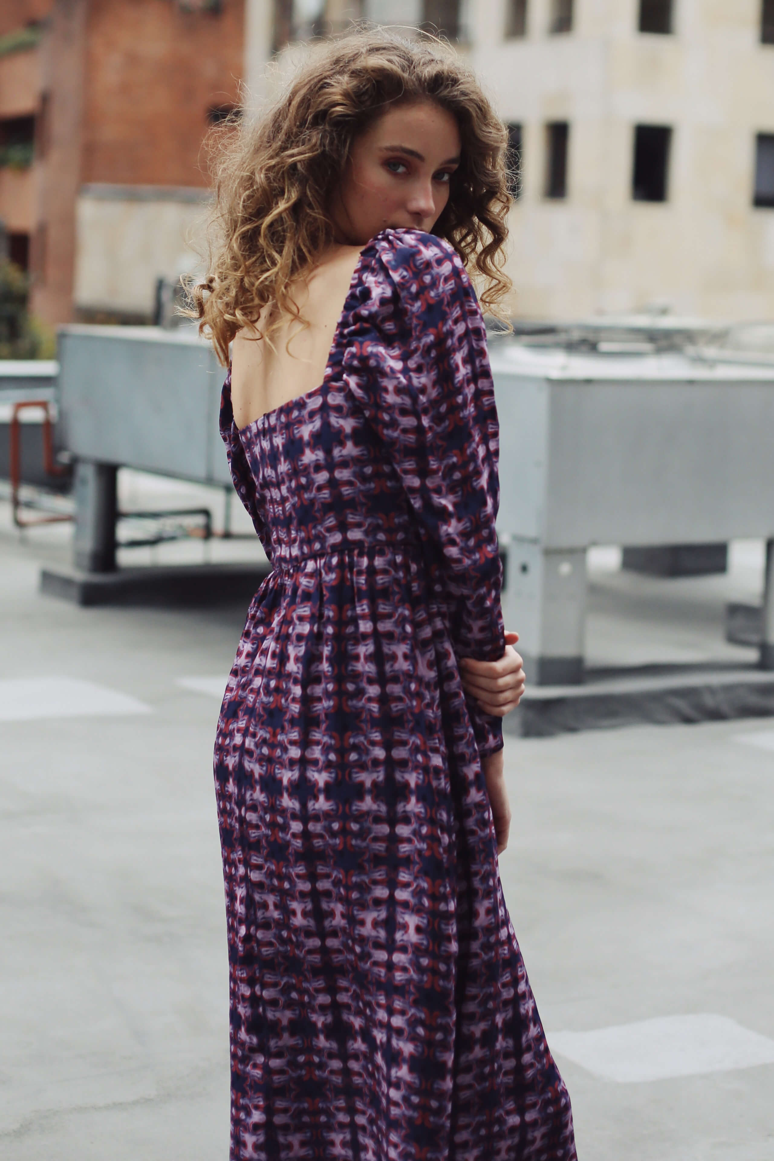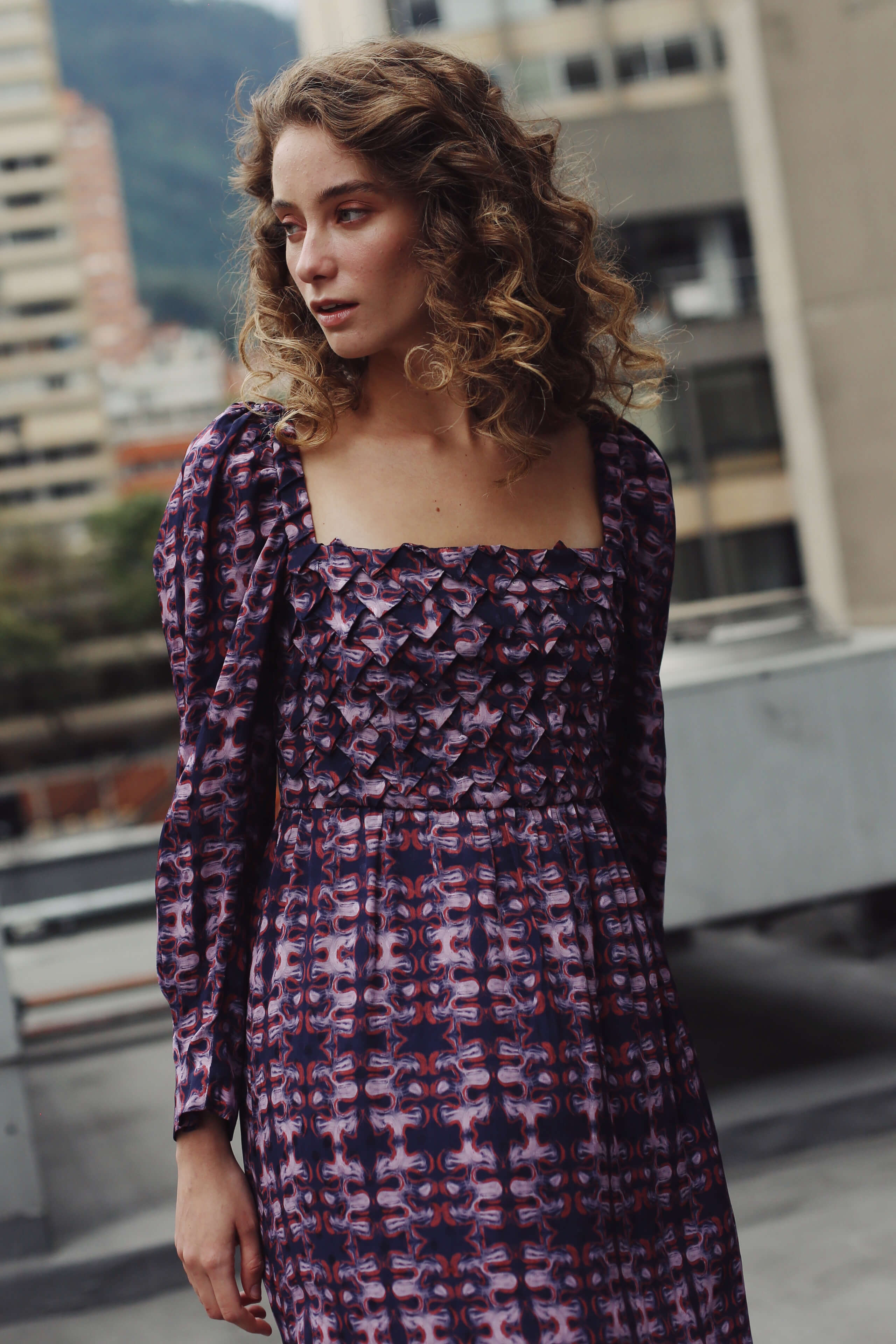 El Vestido Angélica es una pieza larga y elegante, confeccionada en tela de puntos satinados con un exclusivo estampado abstracto en azul oscuro y tonos morados. Su detalle fruncido artesanal en el corpiño aporta textura y sofisticación, mientras que las mangas largas abullonadas con elástico en los hombros suman volumen y un aire romántico. El escote cuadrado realza la silueta, y las aberturas laterales en la falda brindan movimiento y frescura.