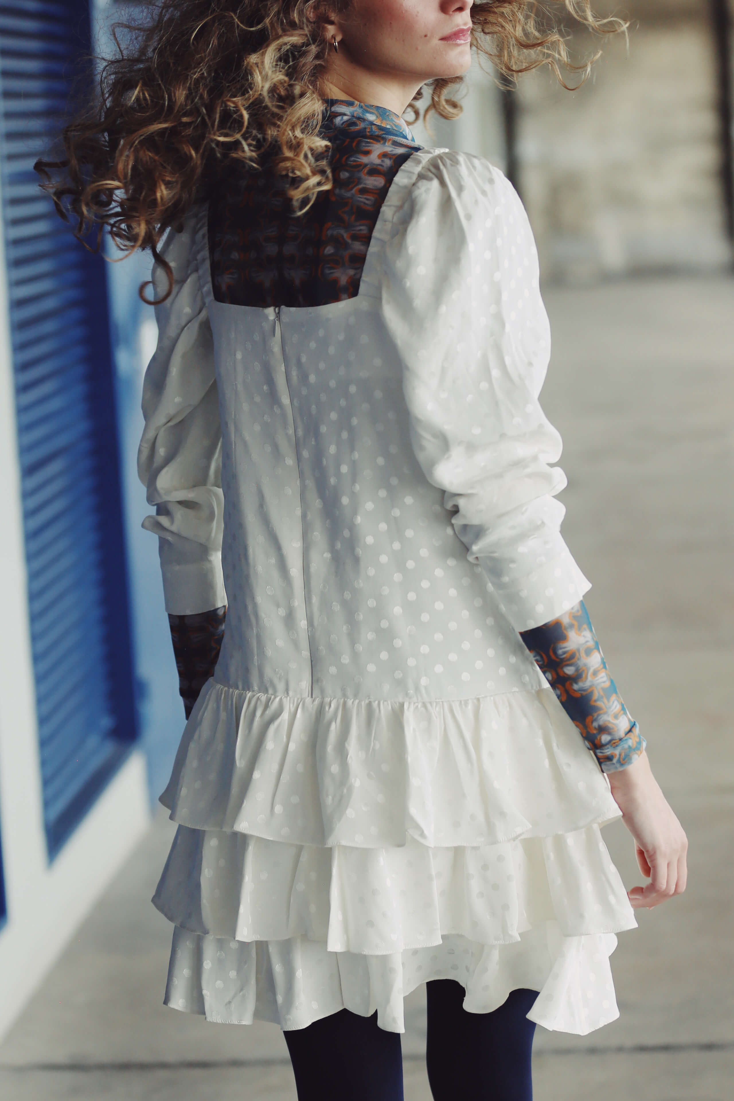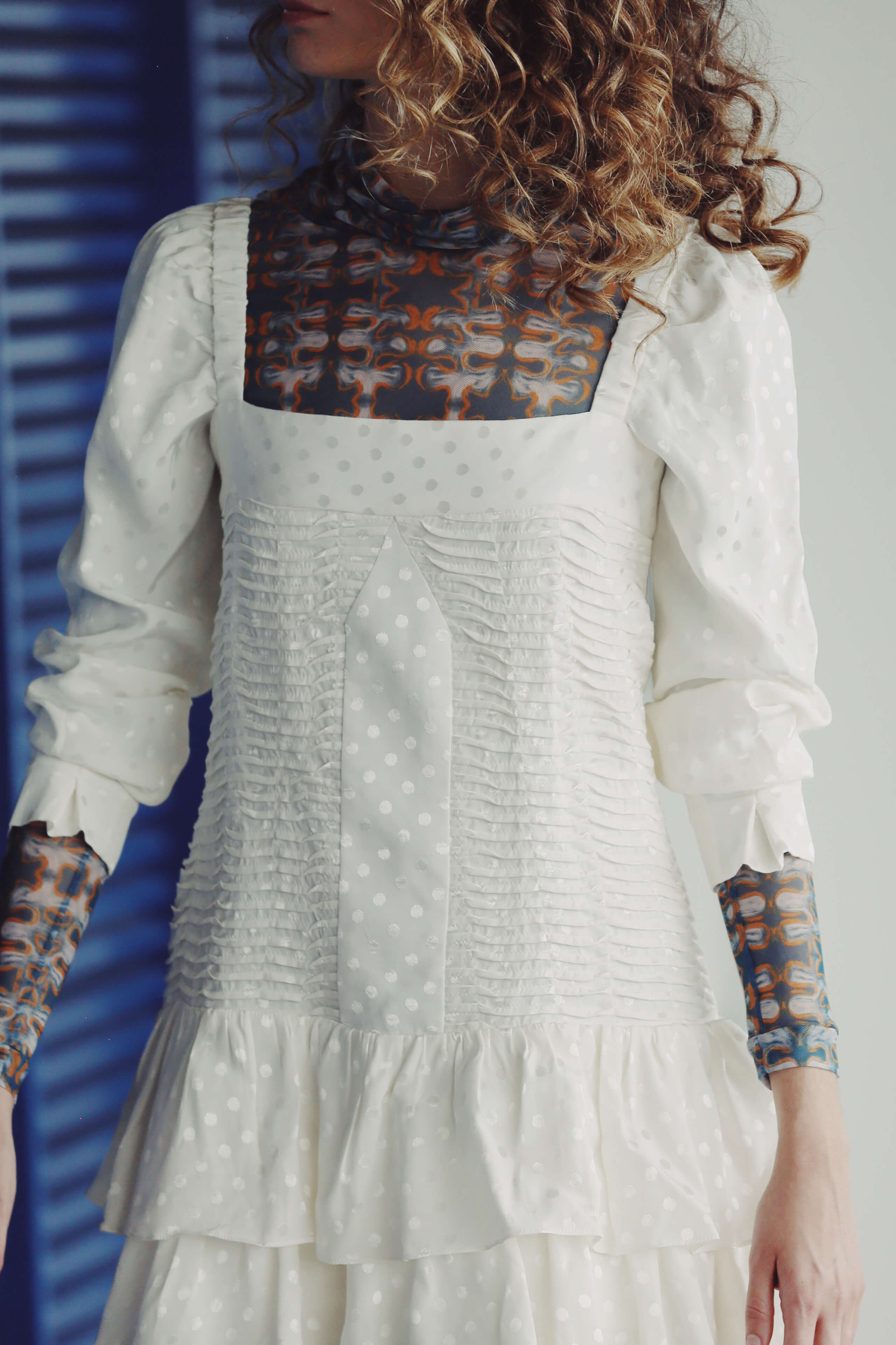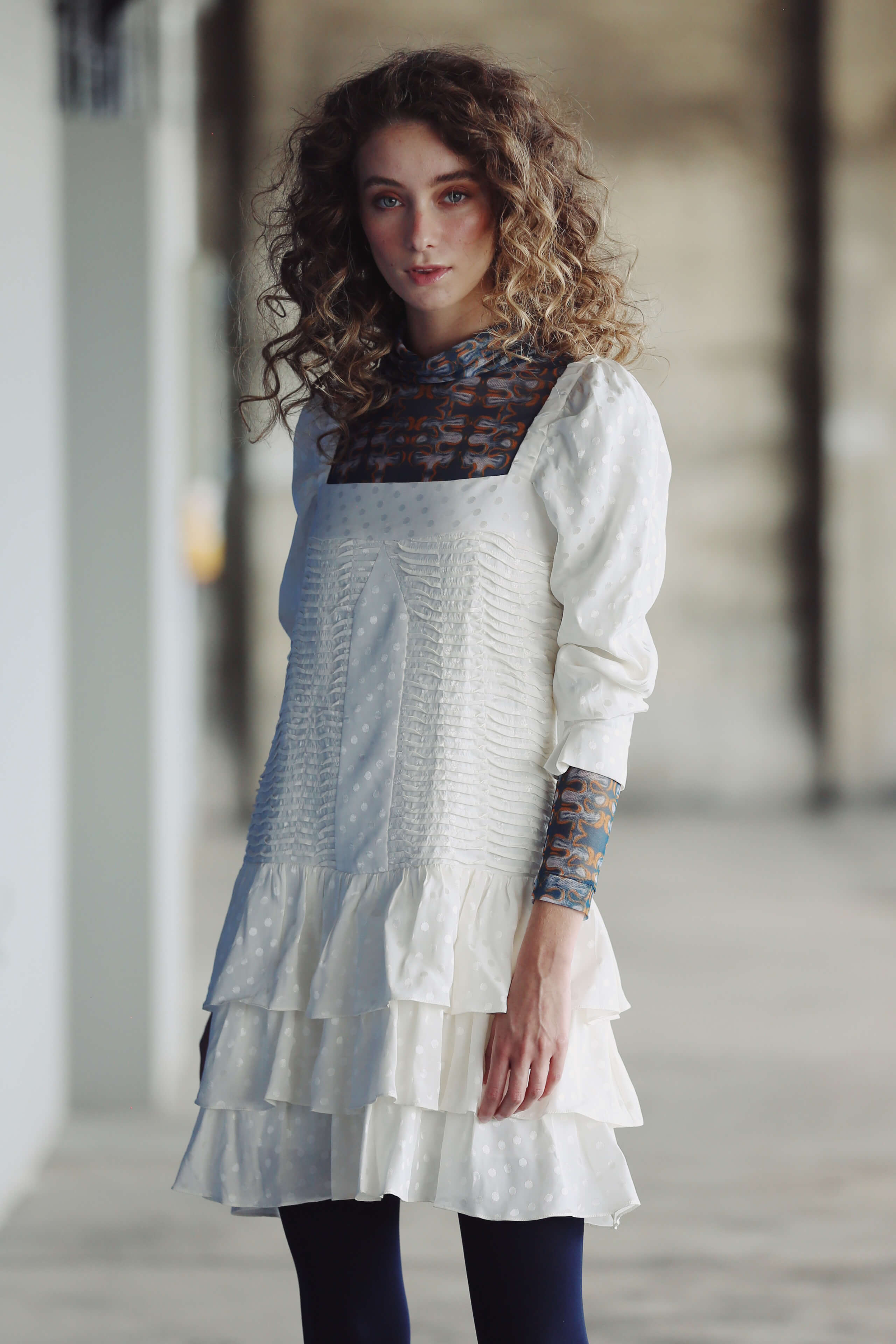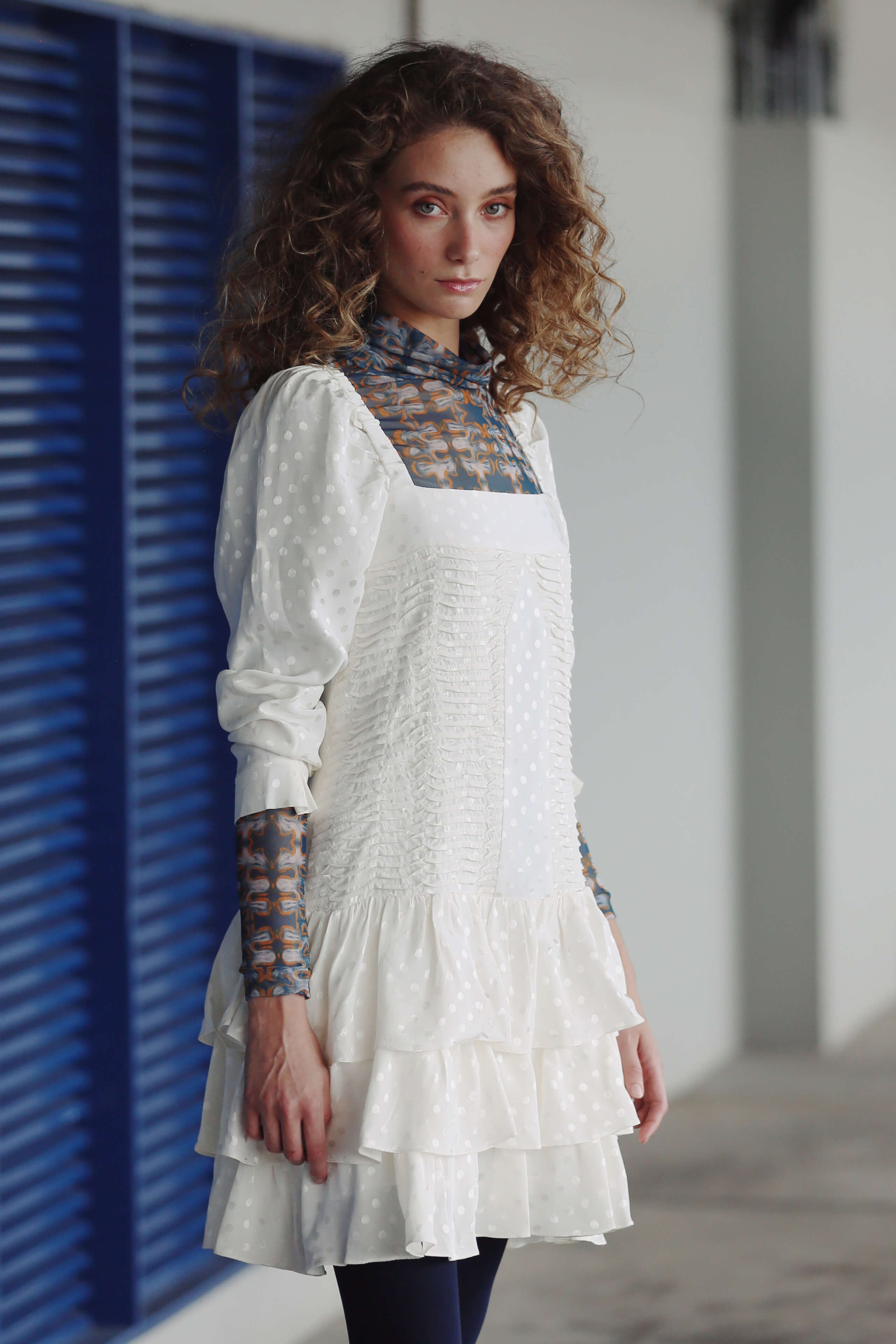 El Vestido Maria es una pieza corta y sofisticada, confeccionada en tela de puntos satinados que reflejan la luz con sutileza. Presenta un delicado detalle de alforzas onduladas en el cuerpo, que añade textura y realce visual. Su escote cuadrado y corte de cintura caída definen una silueta relajada y femenina, mientras que la falda de volantes en capas aporta movimiento. Las mangas largas abullonadas con elástico en los hombros complementan el diseño con un aire romántico.