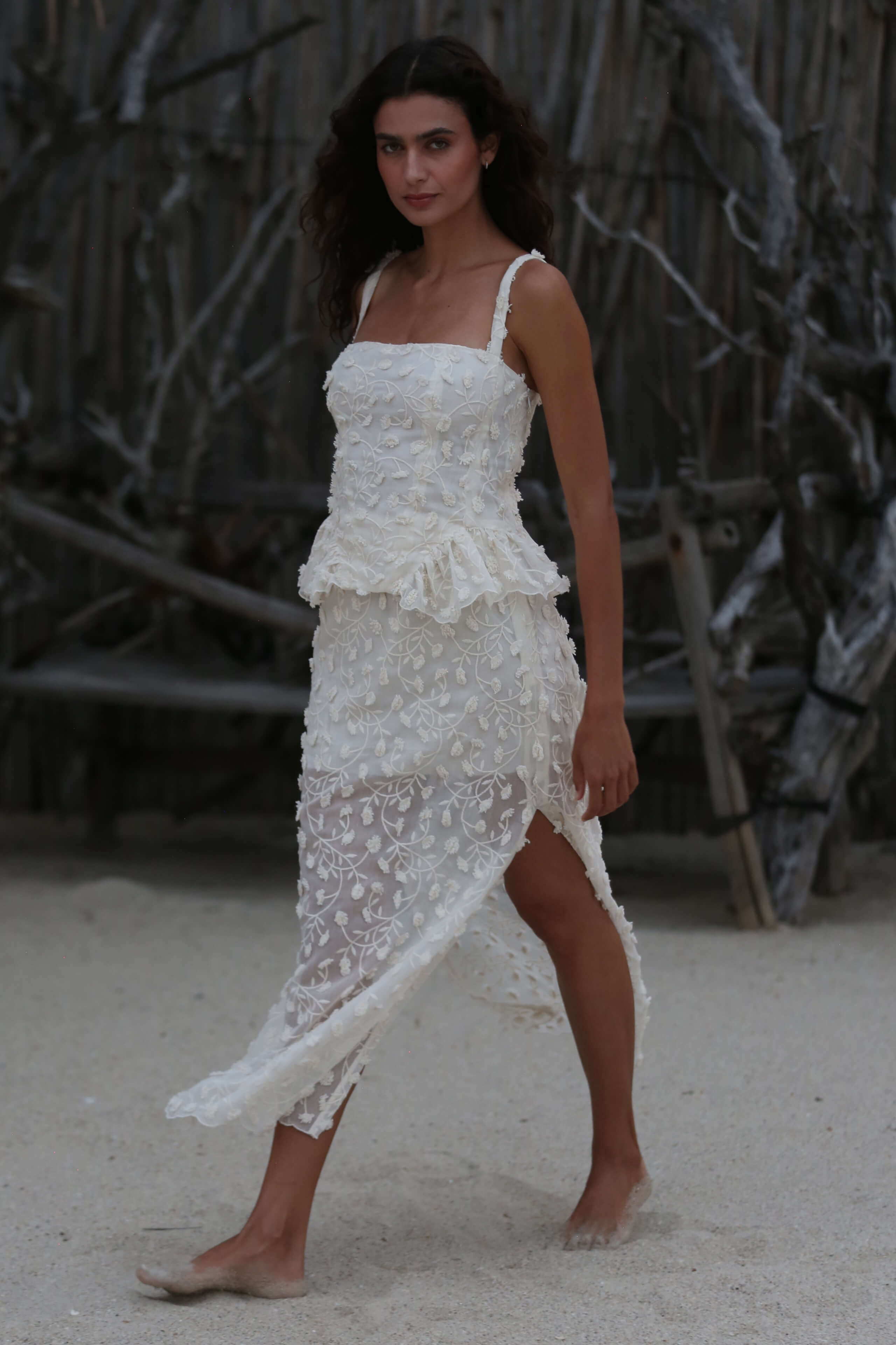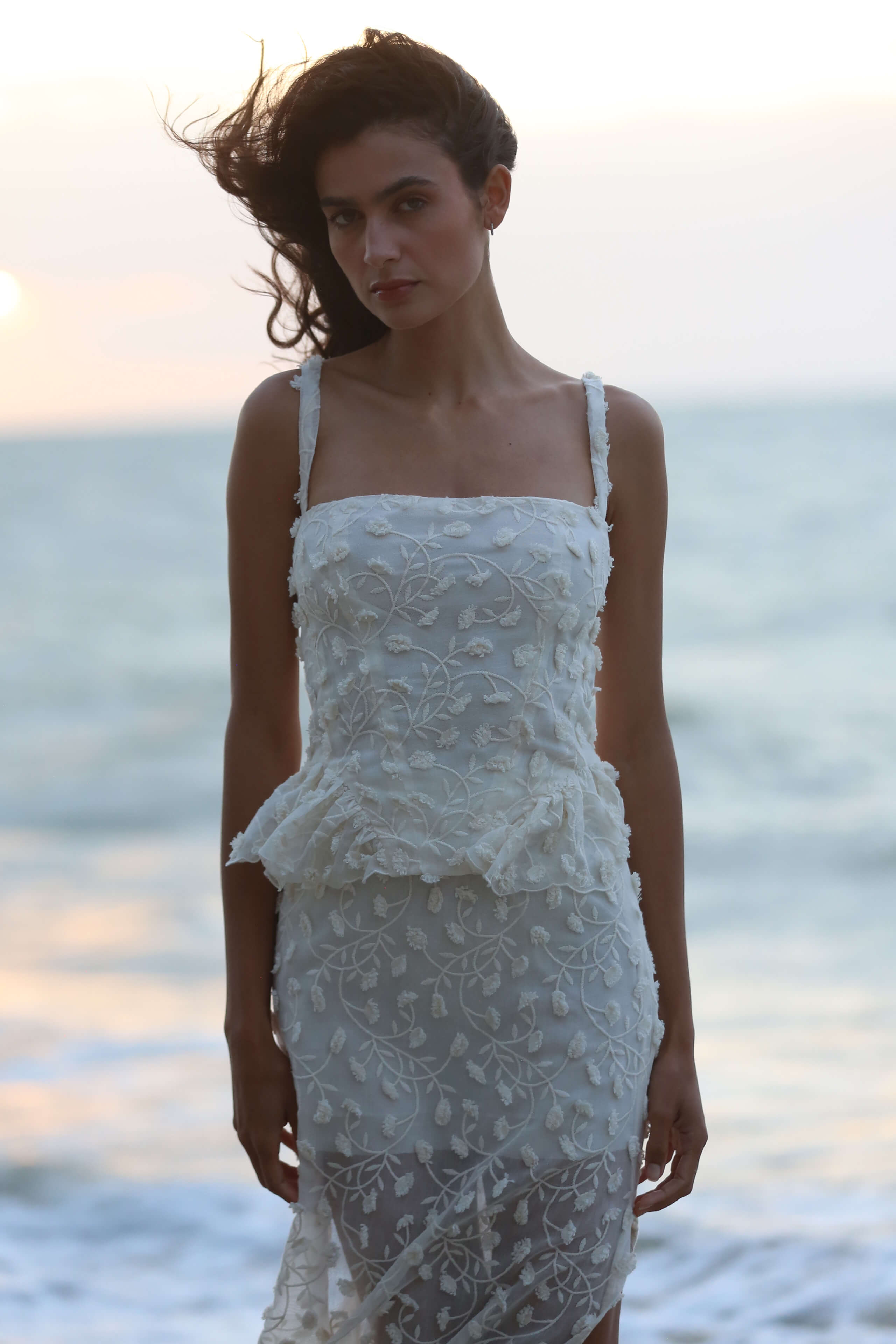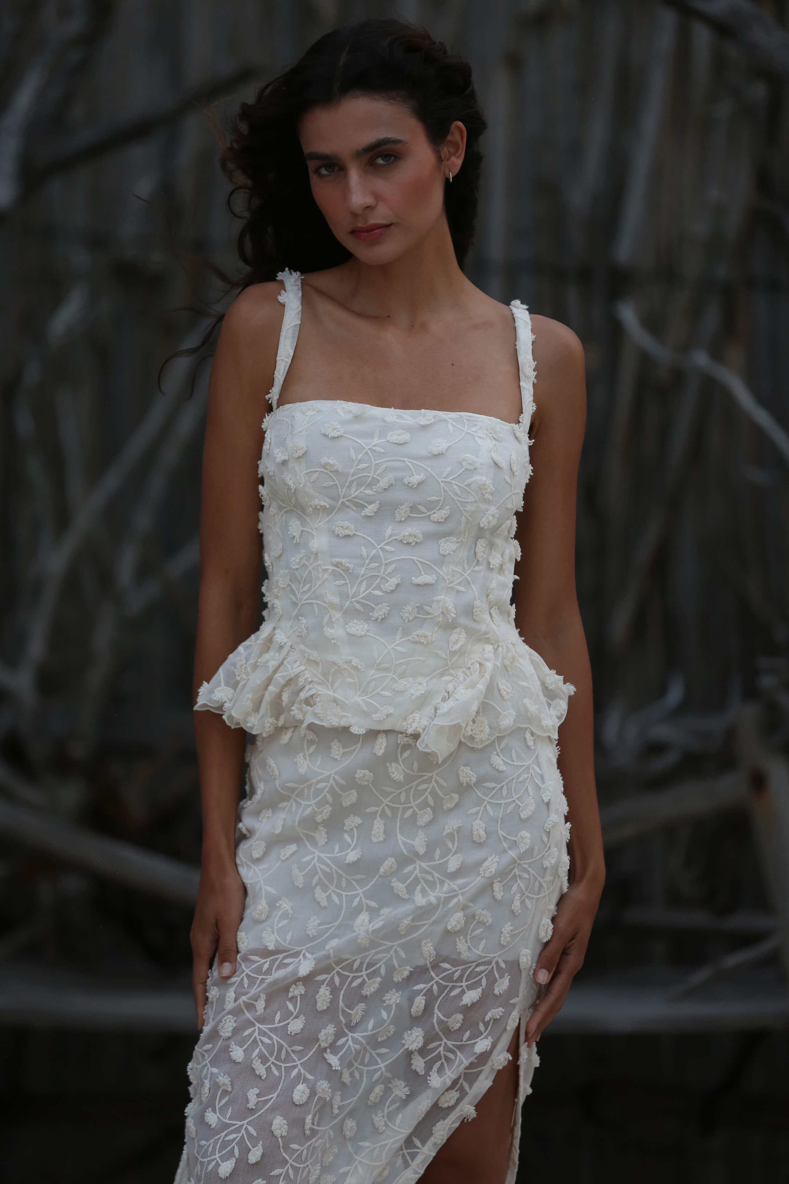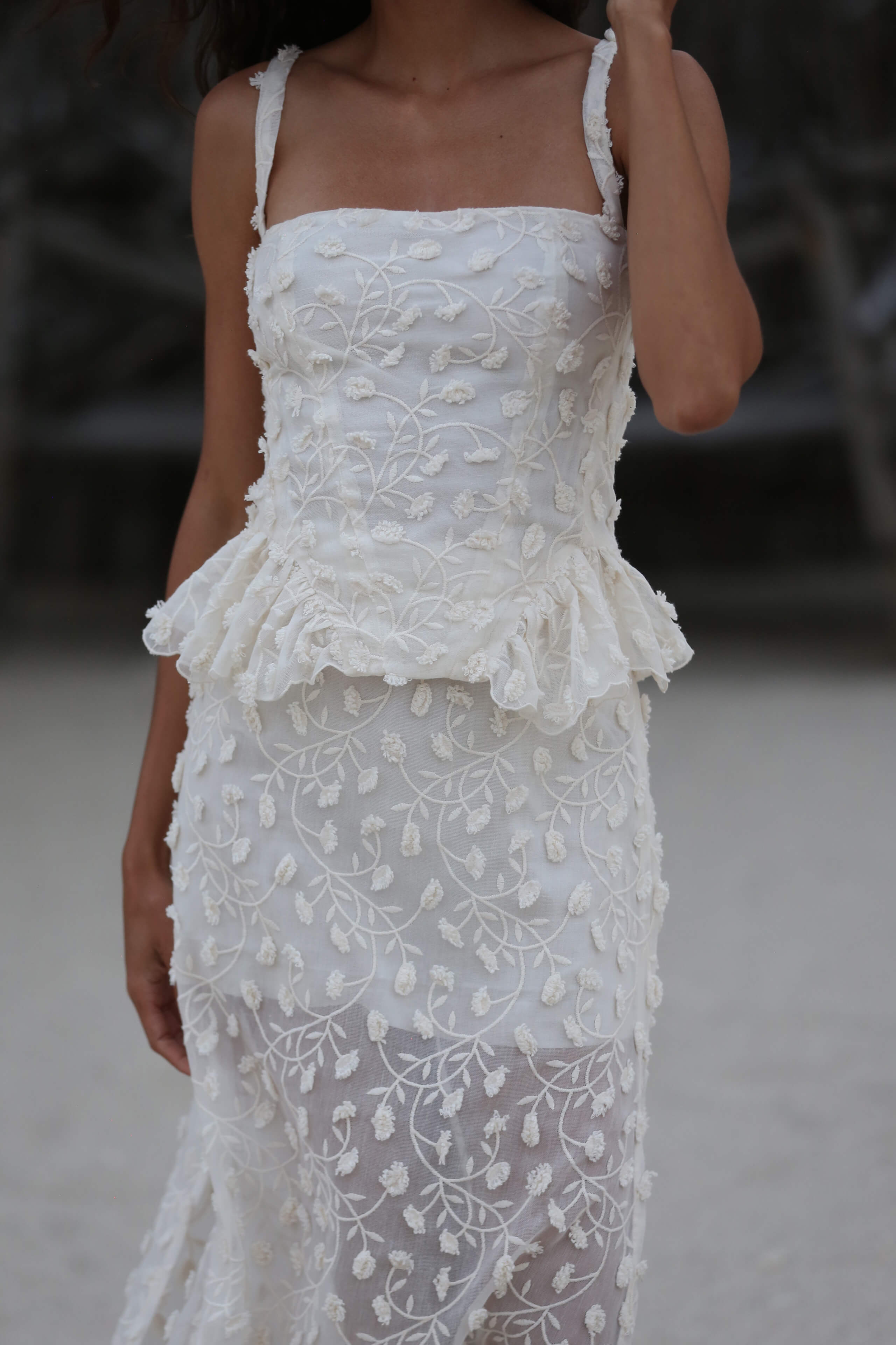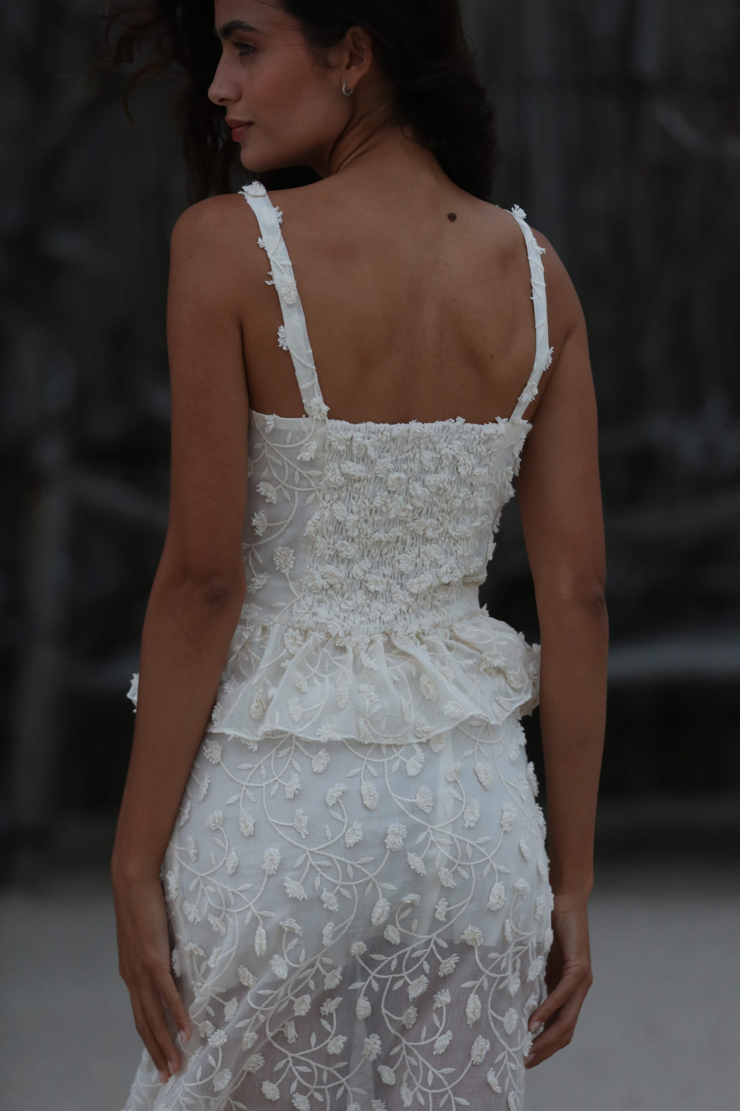 El Top Sofía está confeccionado en algodón bordado con delicados motivos florales en relieve. Su diseño de tirantes y corpiño entallado se complementa con un favorecedor volante en la cintura que aporta movimiento y feminidad. La espalda cuenta con fruncido elástico hecho a mano para mayor comodidad y un ajuste perfecto. Una pieza versátil que combina artesanía y elegancia atemporal.
