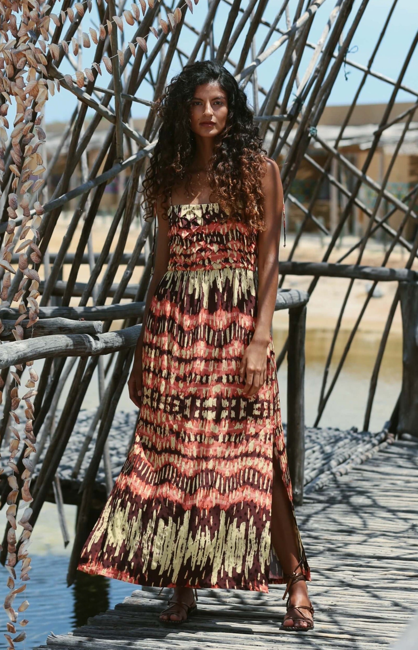 The Atenea dress features a distinctive handmade scale-inspired pleated bodice defined by delicate thin self-tie shoulder straps for a personalized fit. Luxurious sateen polka-dot detailing overlays the abstract print, while knee-high side skirt slits add movement to the column silhouette.