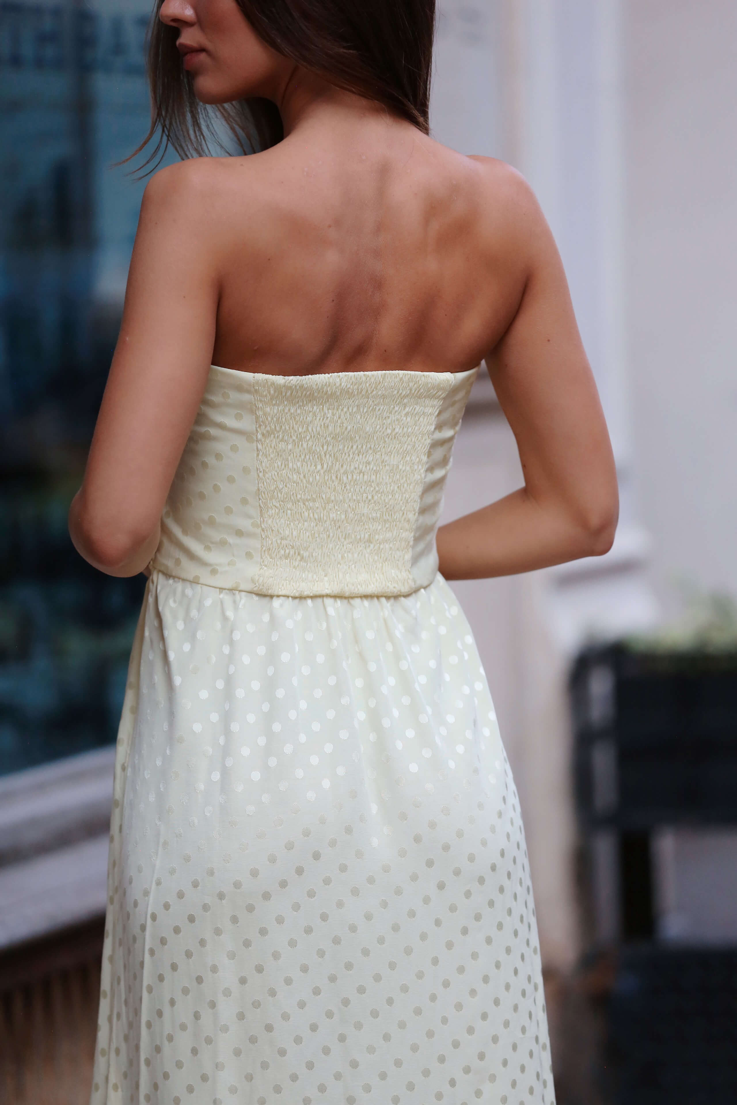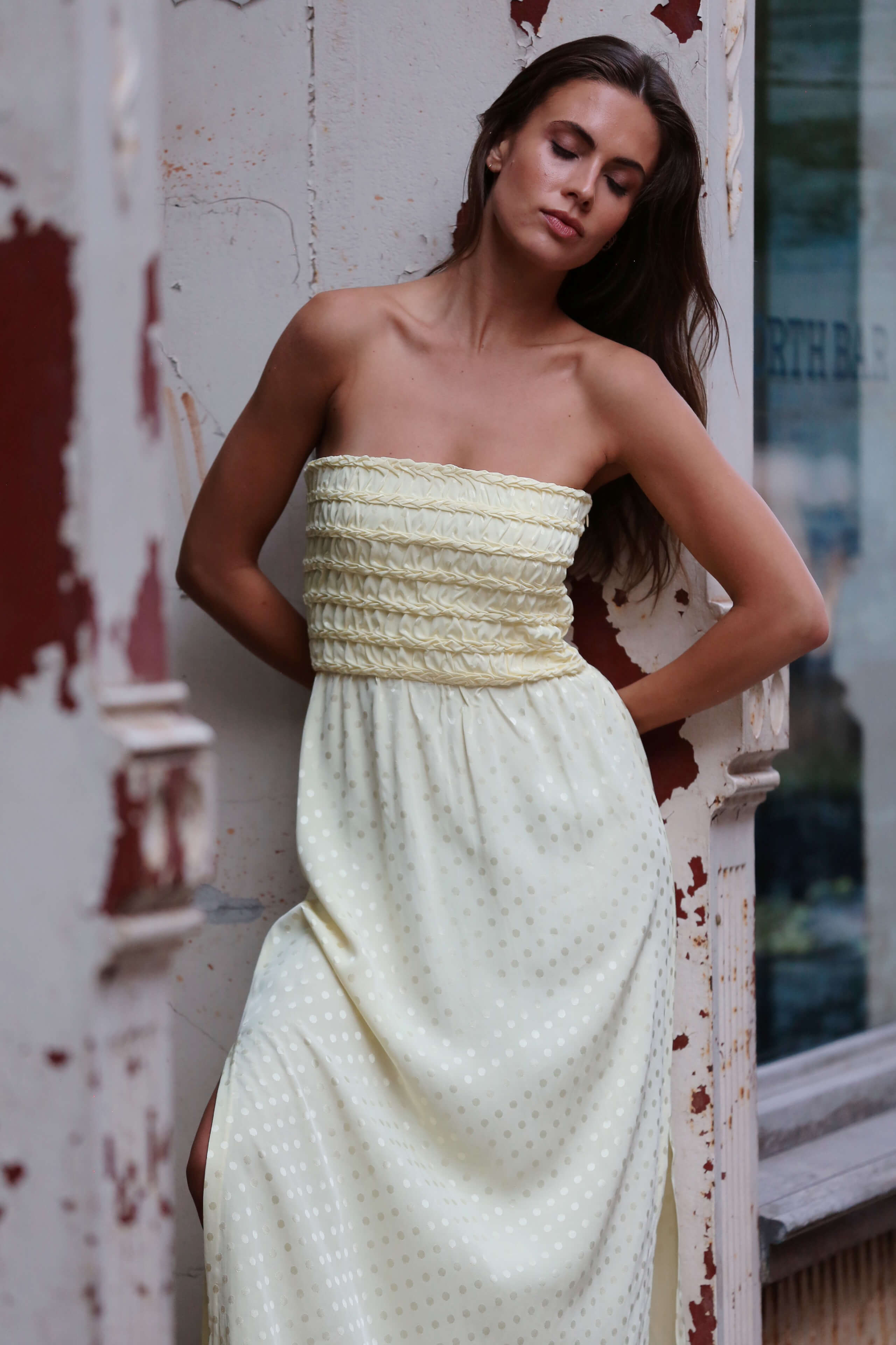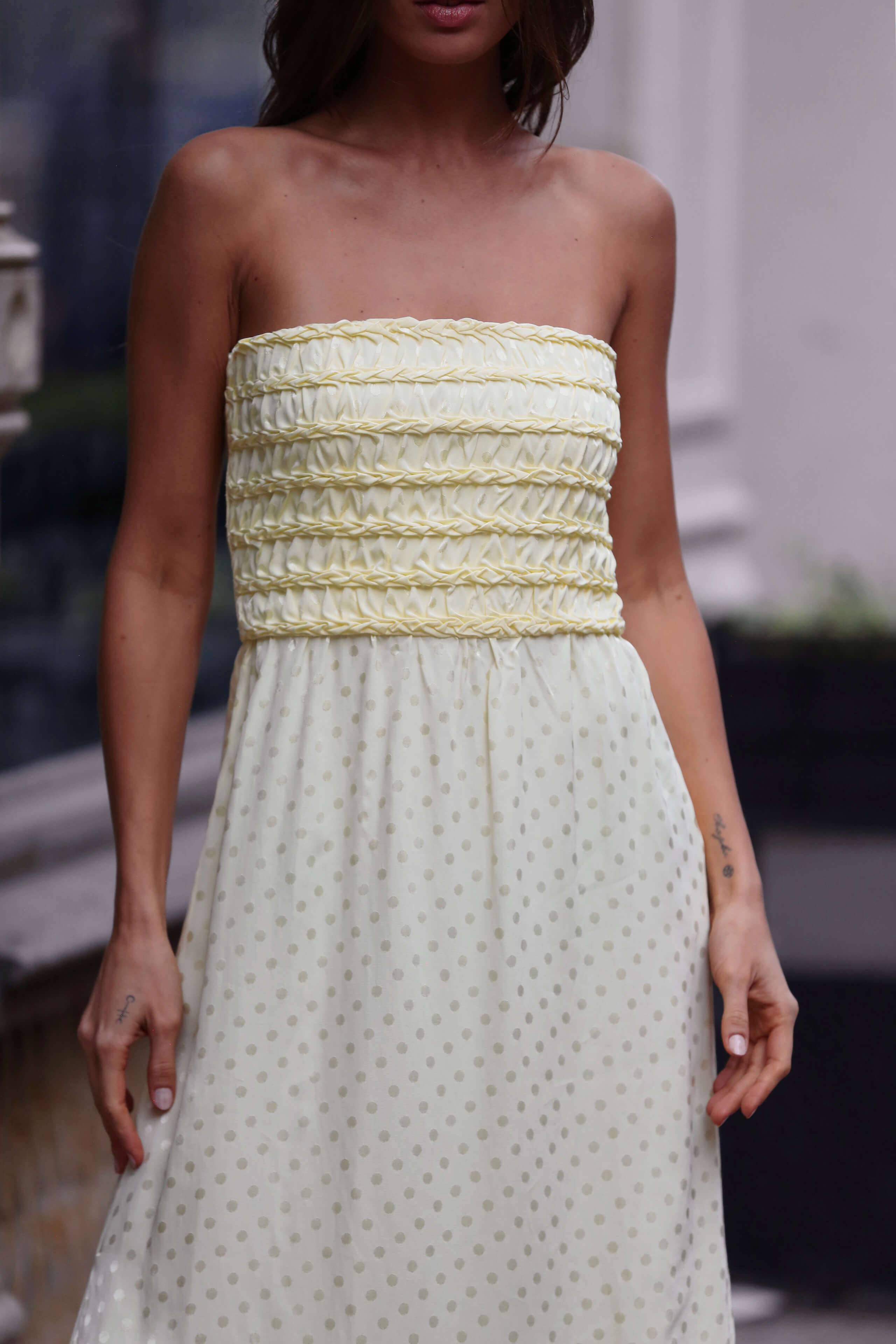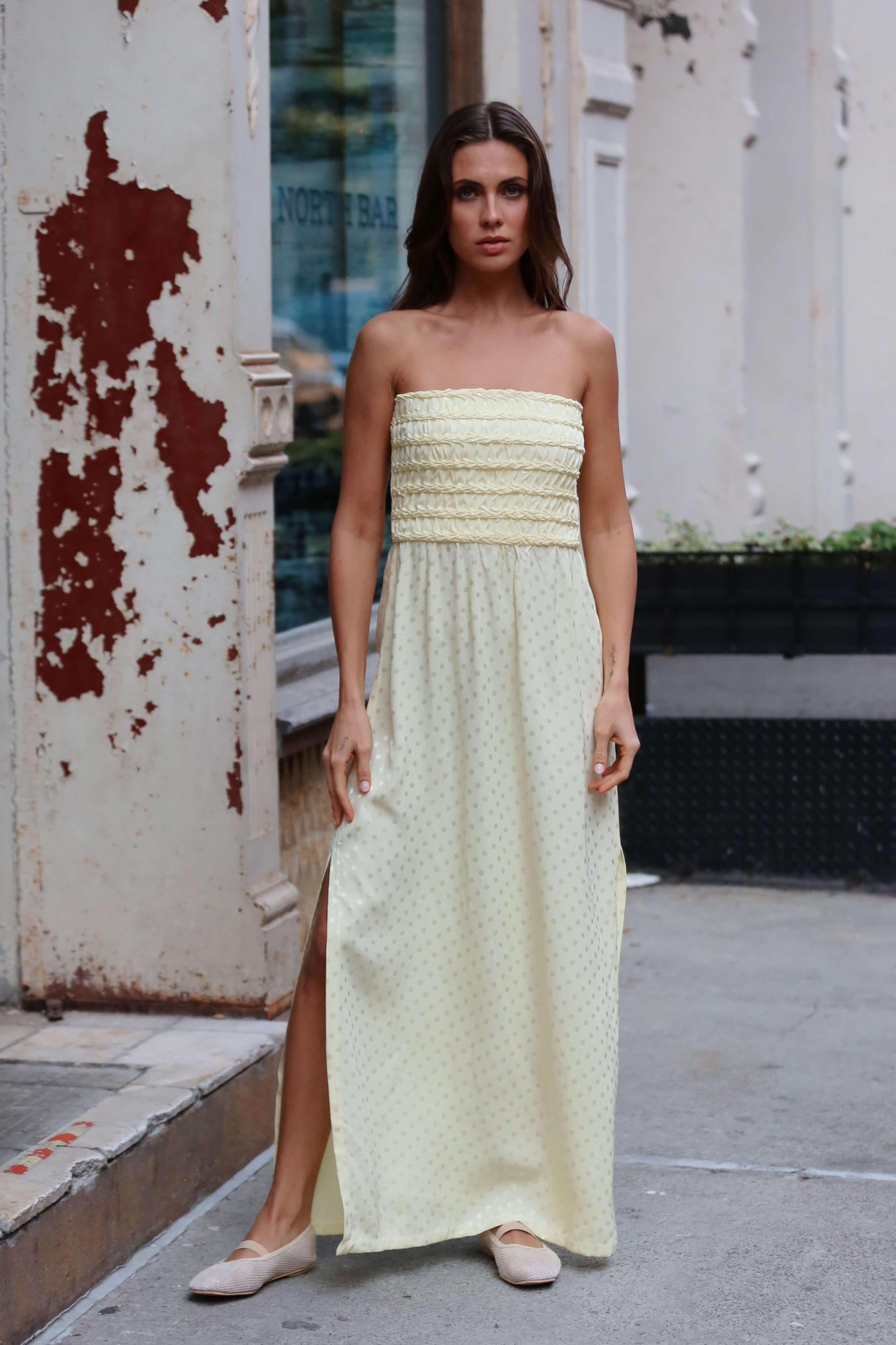 El Vestido Roser es una pieza romántica y ligera, confeccionada en una delicada tela estampada con lunares brillantes color amarillo mantequilla. Su parte superior presenta una textura fruncida hecha a mano que se adapta al cuerpo, mientras que su silueta columna y abertura lateral aportan fluidez al caminar. El escote strapless y la espalda con fruncido elástico completan un diseño ideal para días cálidos o eventos especiales.