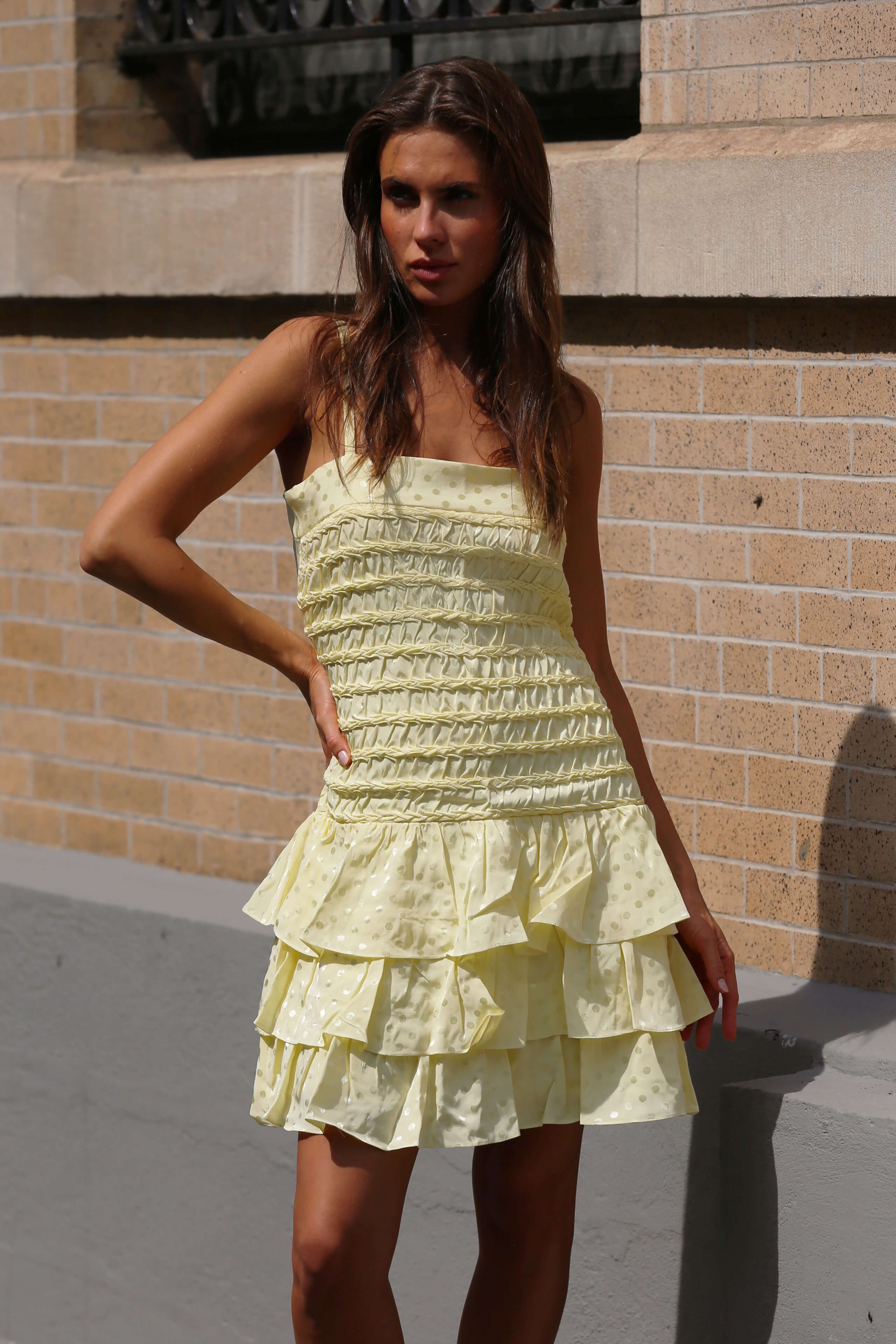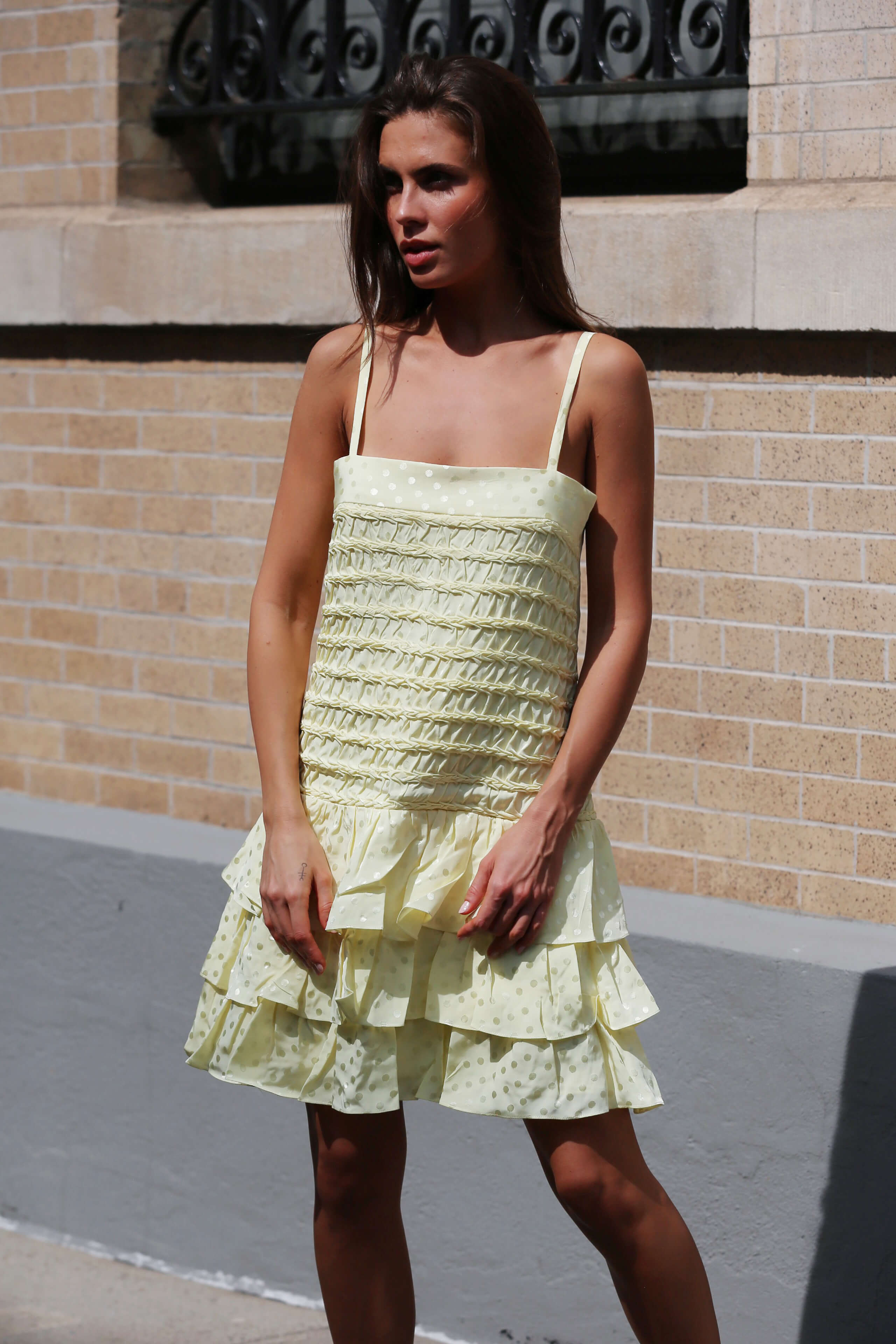 Soledad es un vestido corto encantador, confeccionado en una tela con un estampado de lunares brillantes. Su cuerpo presenta un detalle fruncido hecho a mano que aporta textura y estructura, mientras que el escote cuadrado y el corte de cintura caída realzan su silueta relajada. La falda de volantes en capas le da movimiento y un aire romántico.