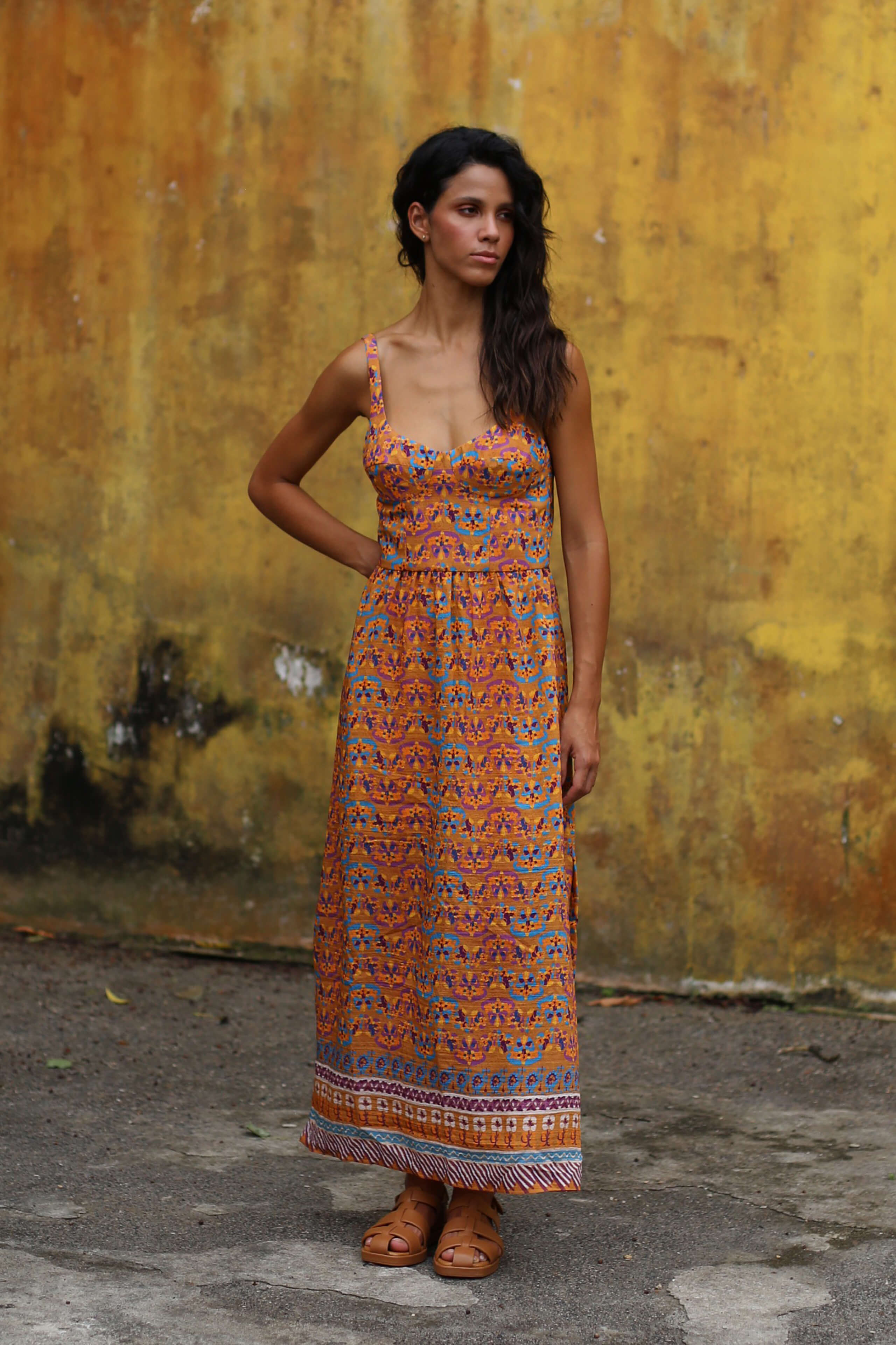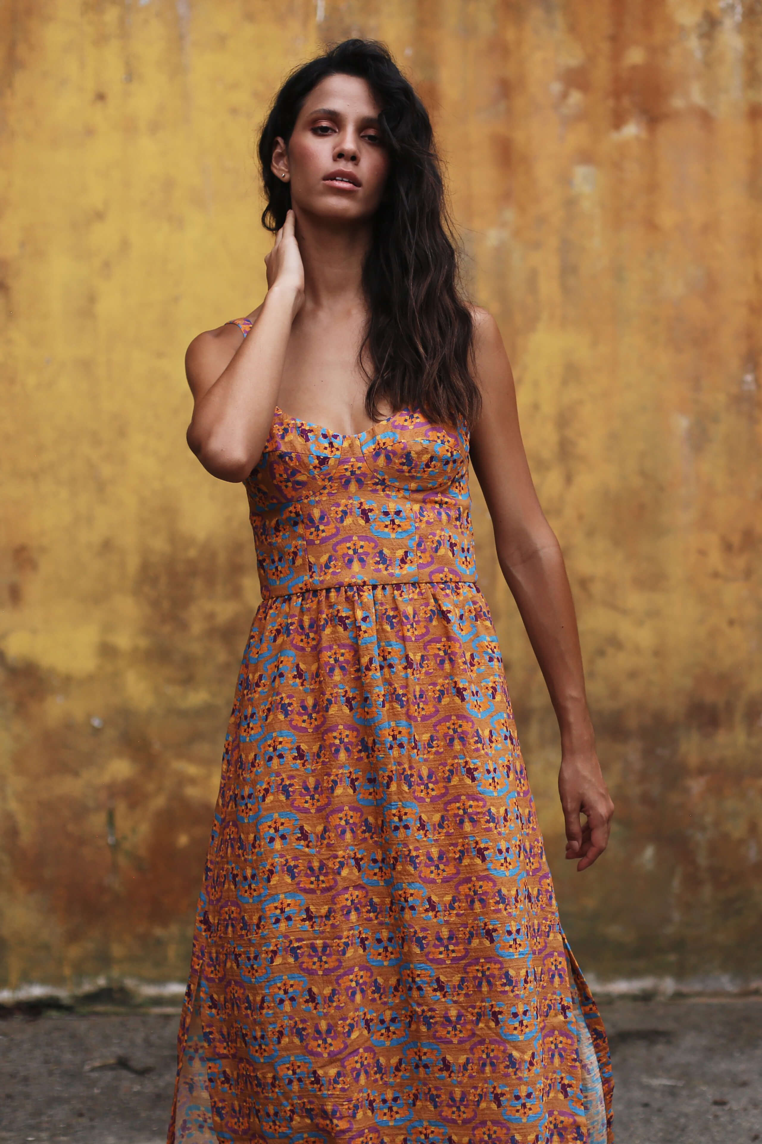 El vestido Beatriz es una pieza sofisticada que presenta copas tipo bustier y un favorecedor escote corazón. Las aberturas laterales en la falda, a la altura de la rodilla, añaden un toque de movimiento a la fluida silueta de columna, creando un efecto dinámico.