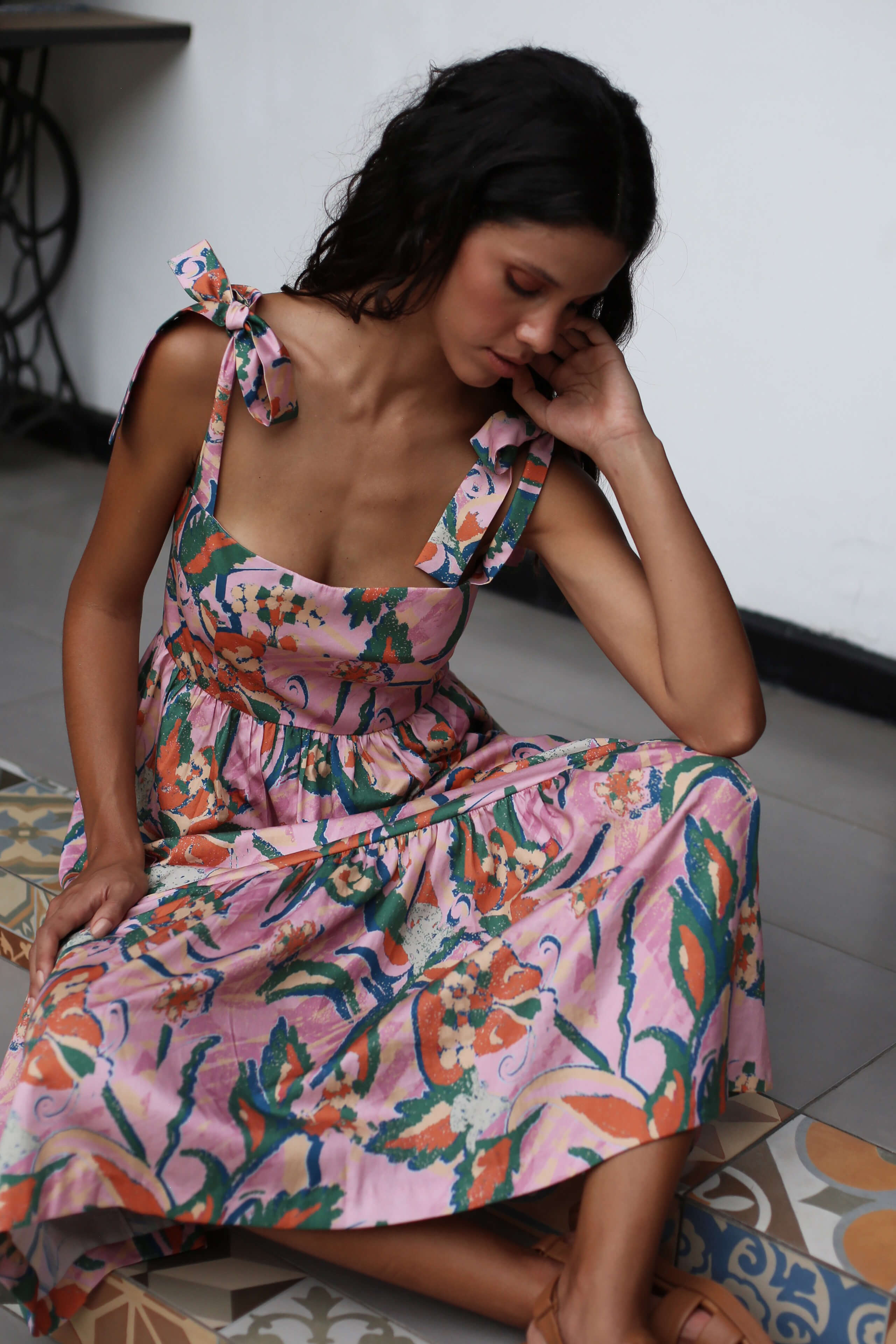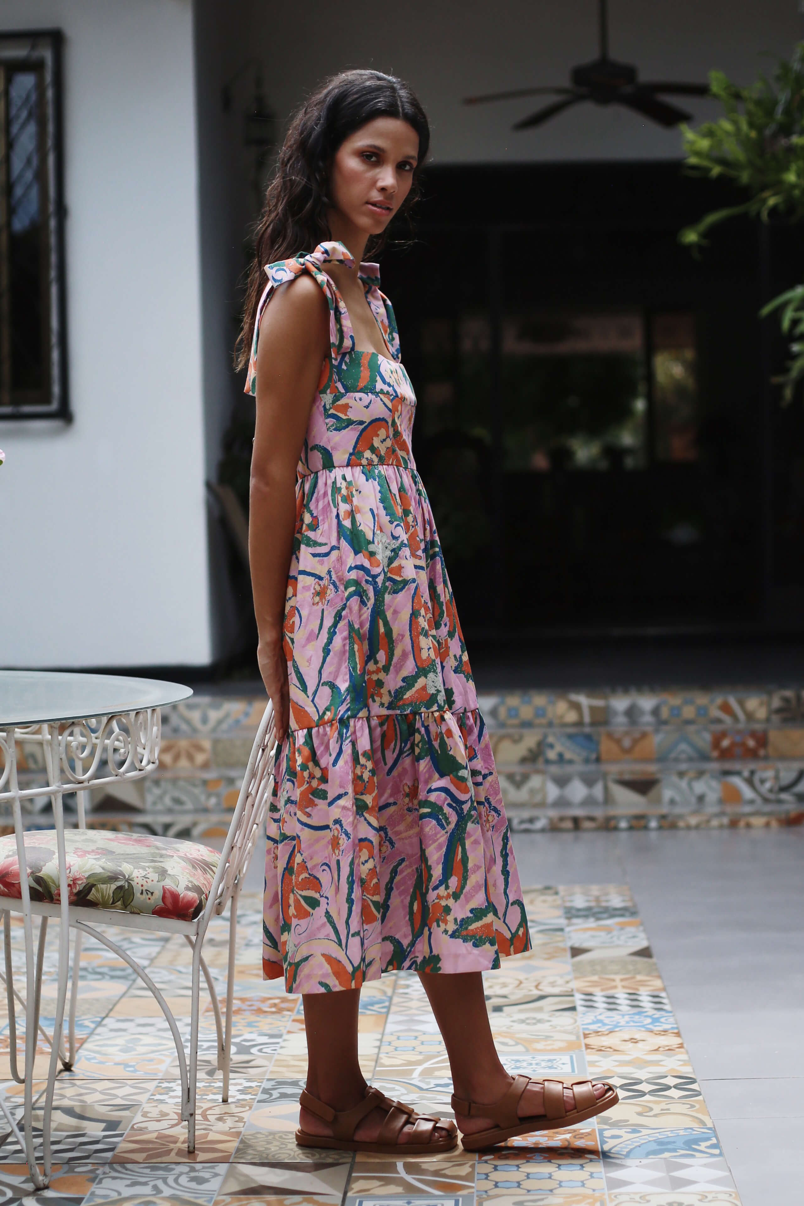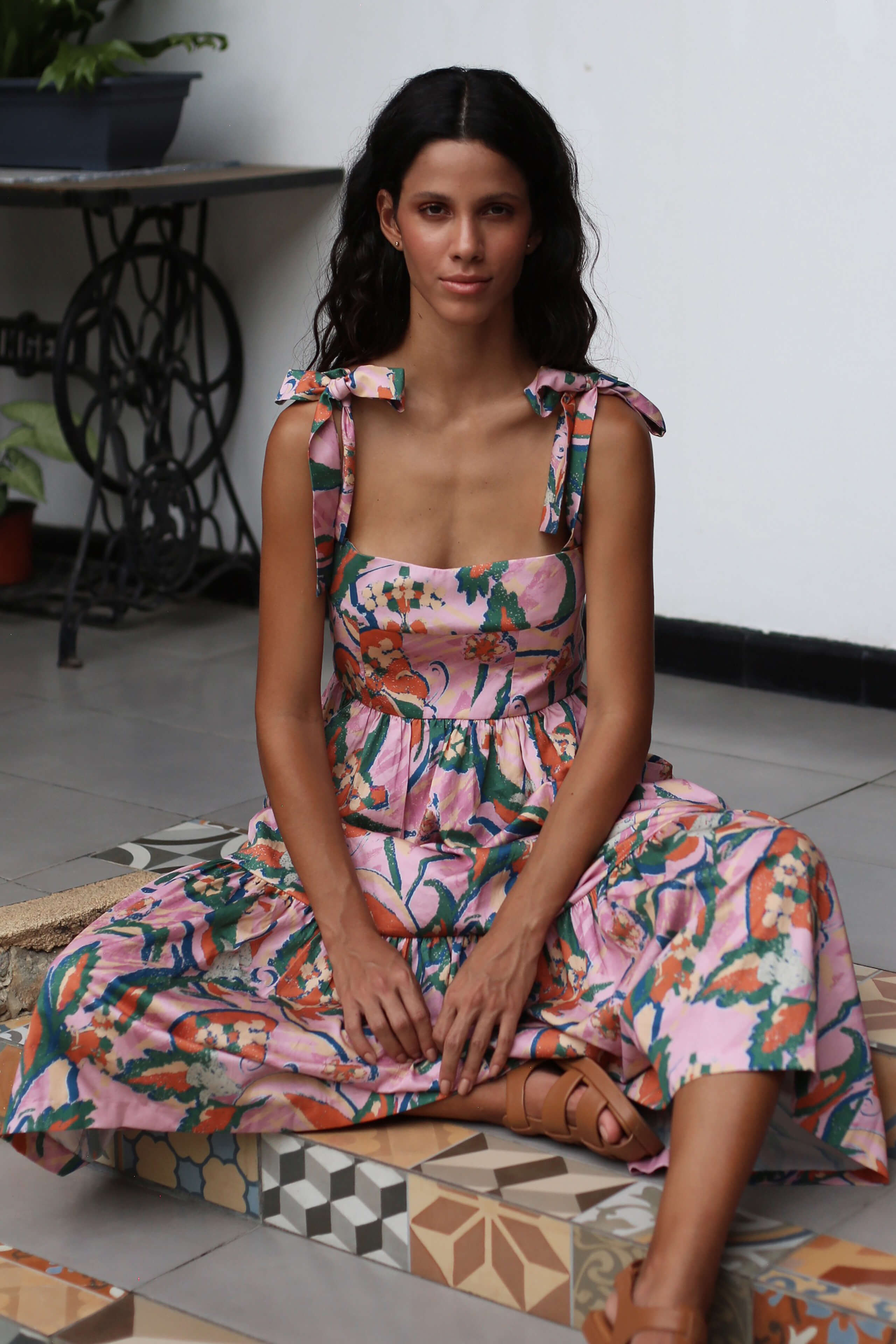El vestido Gabriela, confeccionado en 100% algodón, combina diseño y comodidad con detalles que marcan la diferencia. Su silueta midi presenta lazos ajustables en los hombros, escote cuadrado, bolsillos laterales y una falda amplia que fluida.