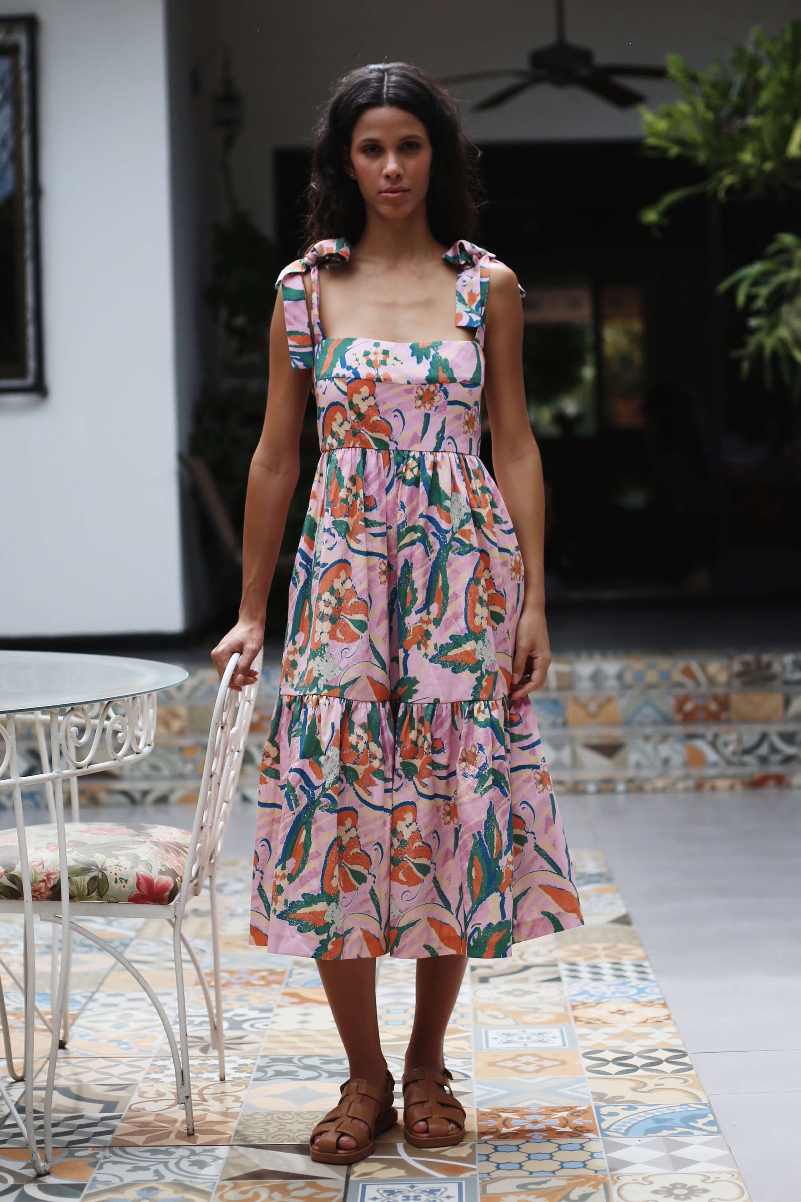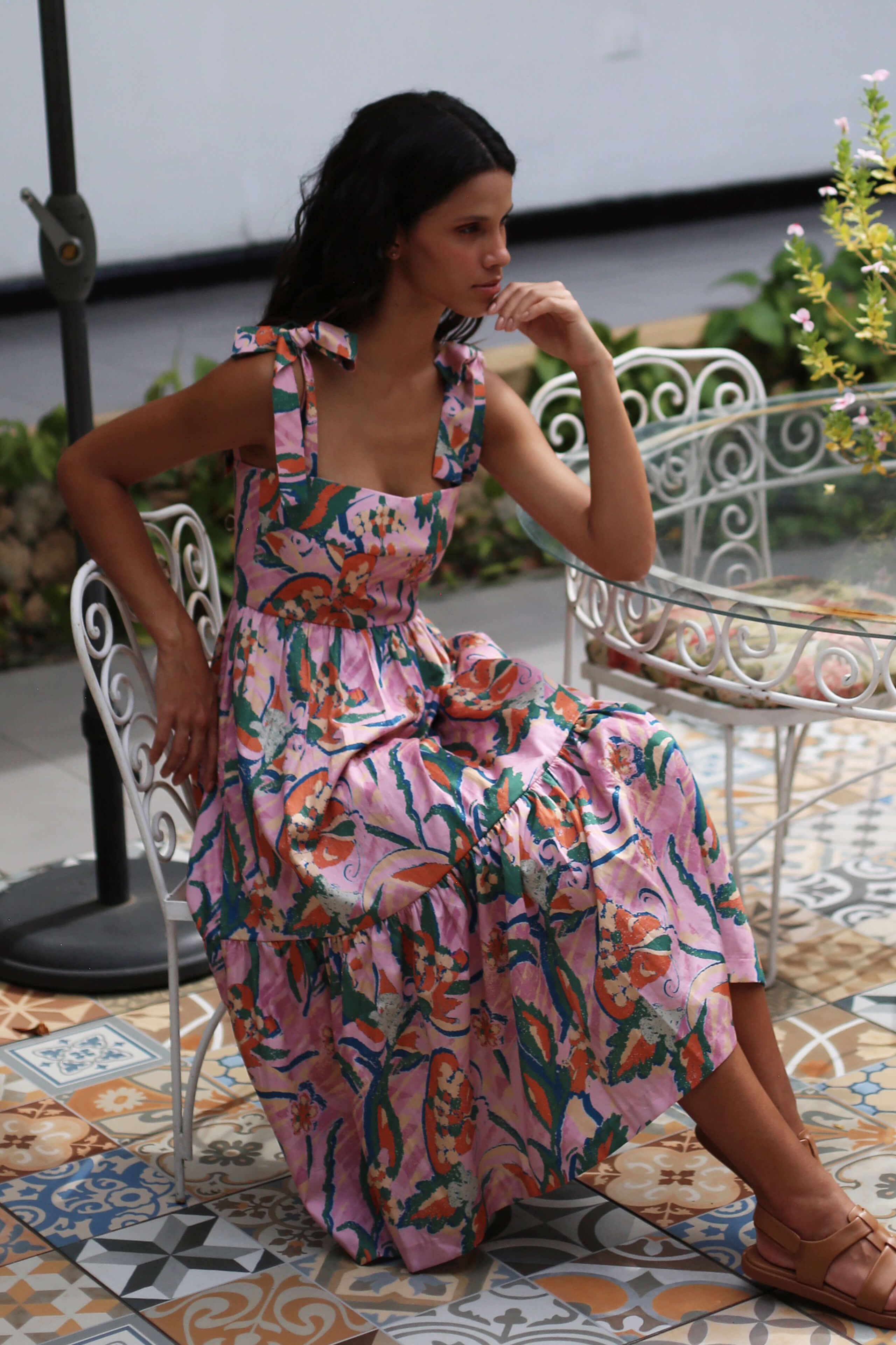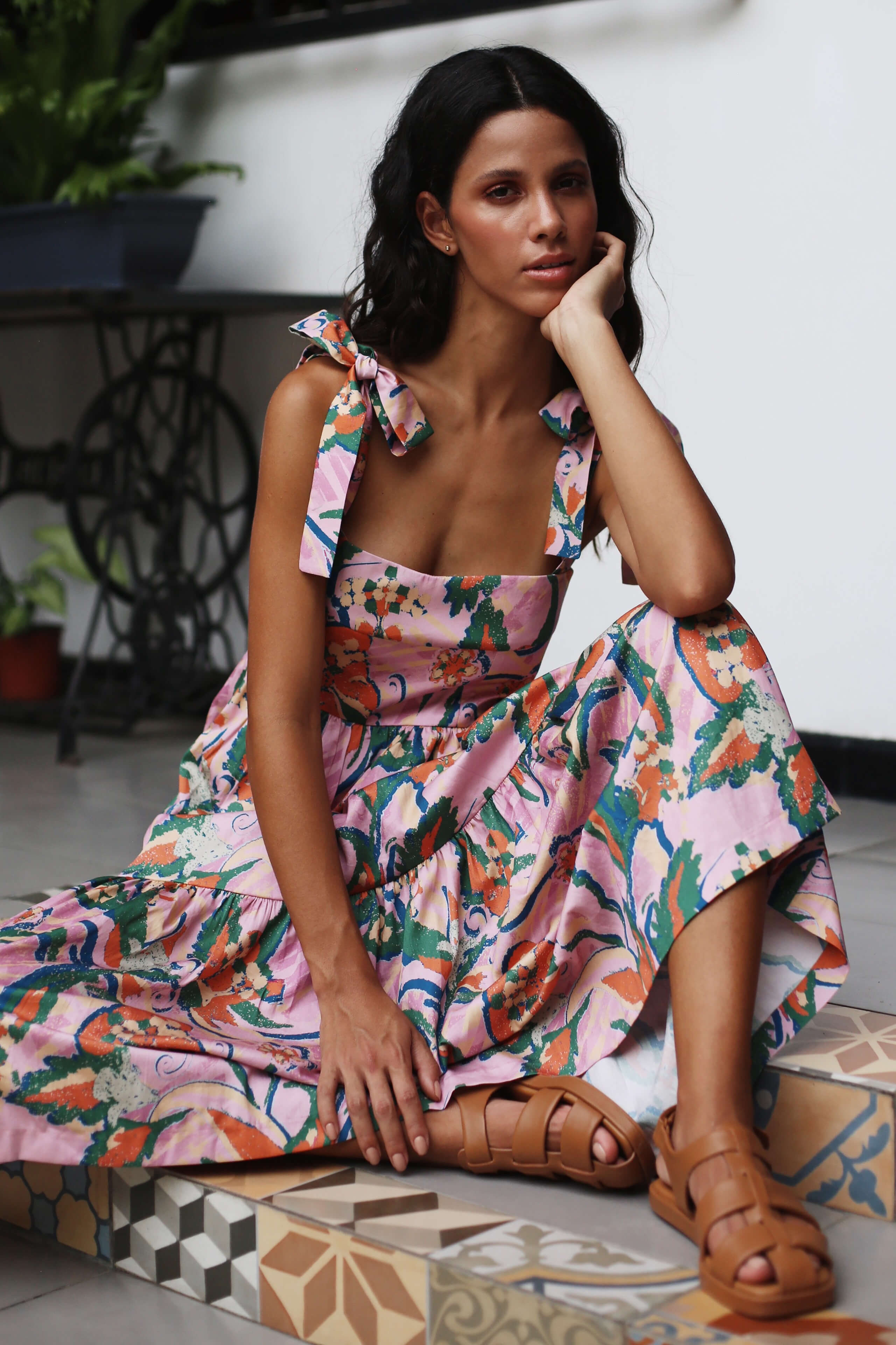 El vestido Gabriela, confeccionado en 100% algodón, combina diseño y comodidad con detalles que marcan la diferencia. Su silueta midi presenta lazos ajustables en los hombros, escote cuadrado, bolsillos laterales y una falda amplia que fluida.