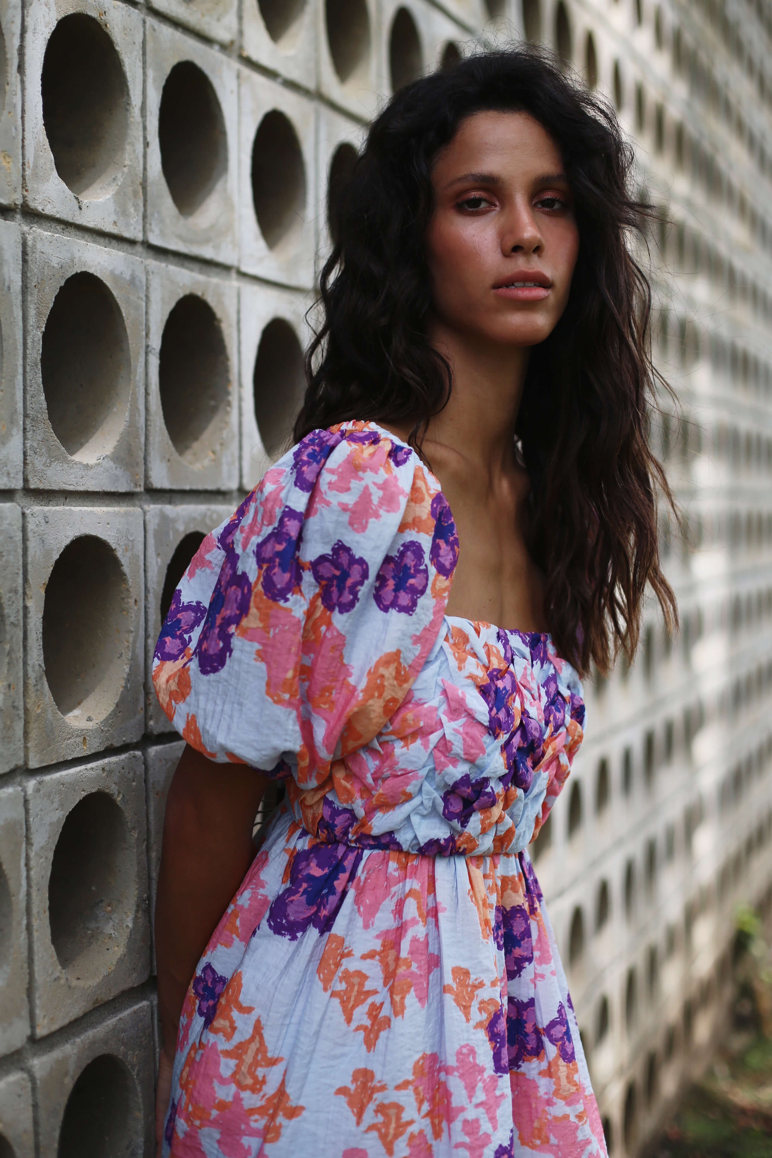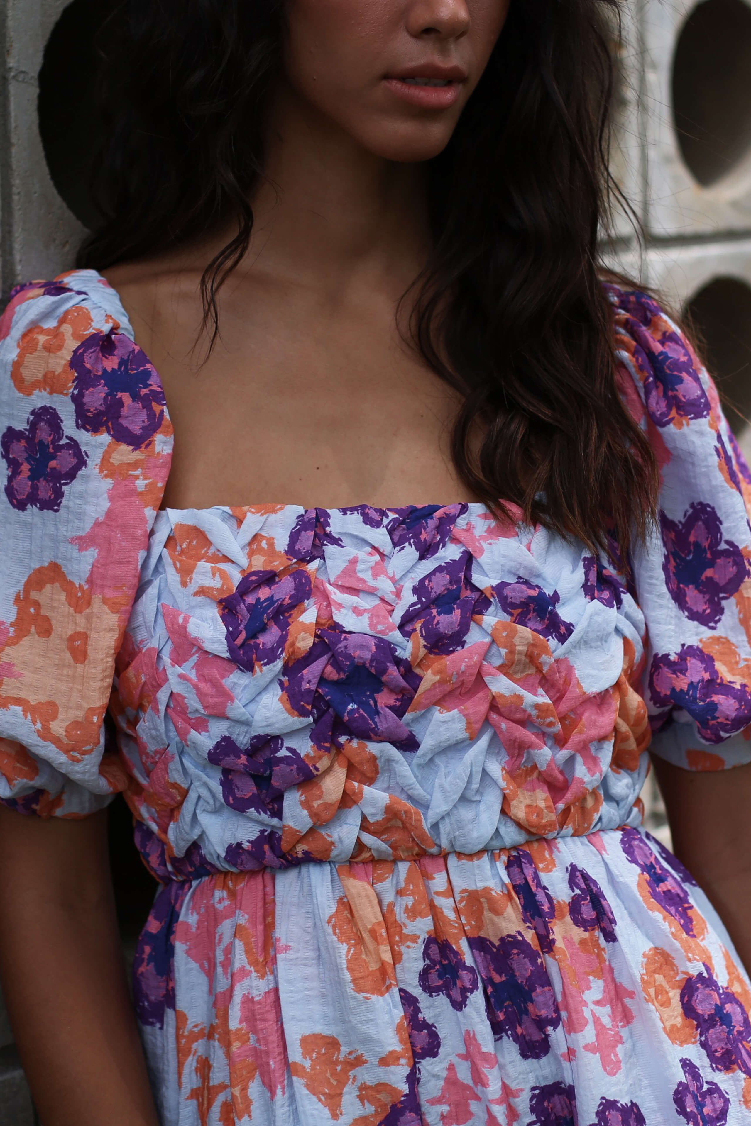 El vestido Lucia es una prenda encantadora y romántica que se destaca por su precioso estampado floral en colores azul y morado. La textura fruncida en forma de hojas hecha a mano, le otorga un toque artesanal distintivo. Las mangas cortas tipo globo con elástico en los hombros añaden un toque romántico y femenino a esta pieza.