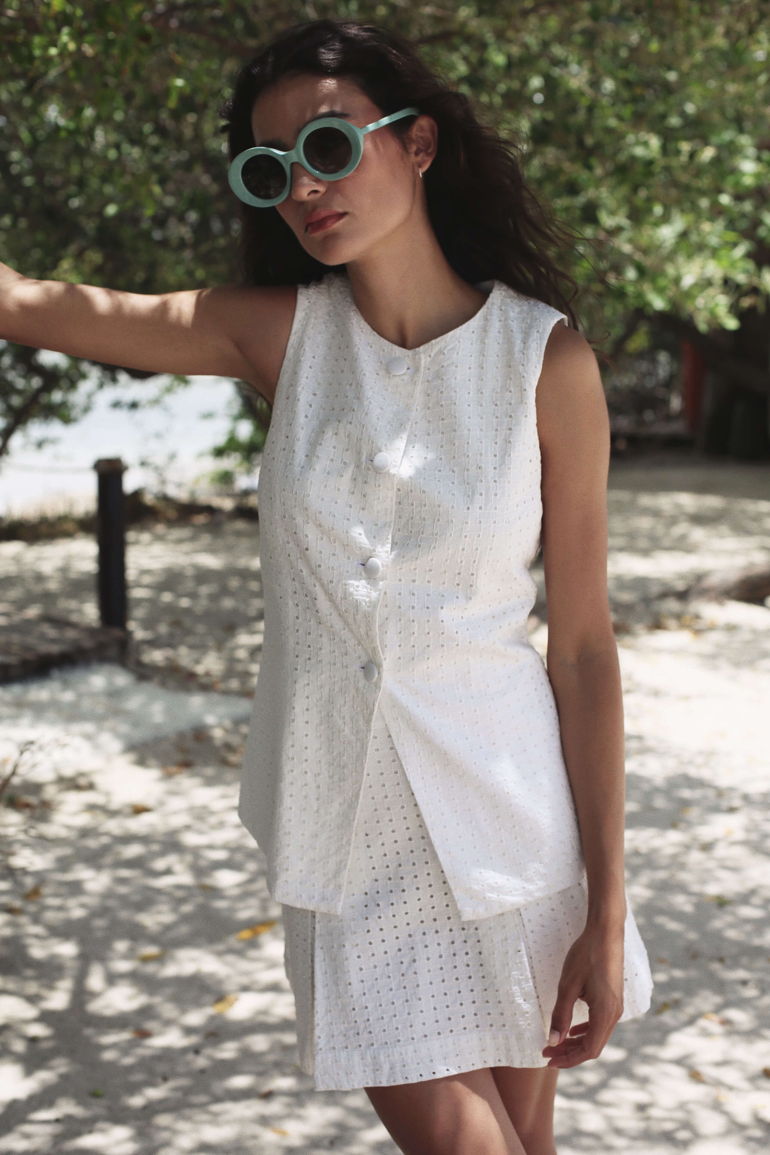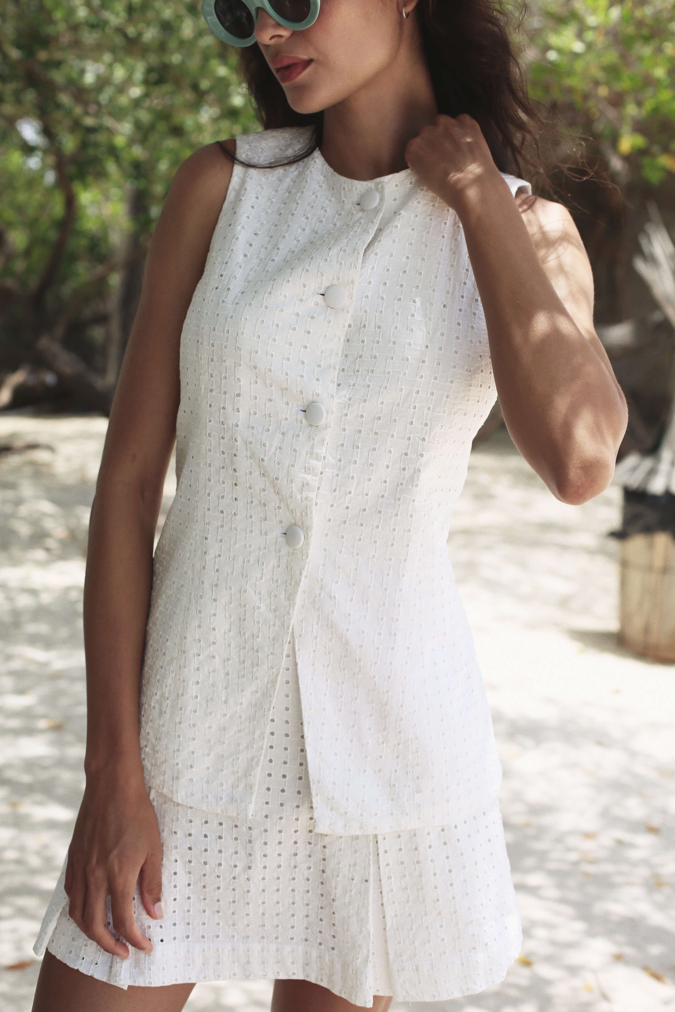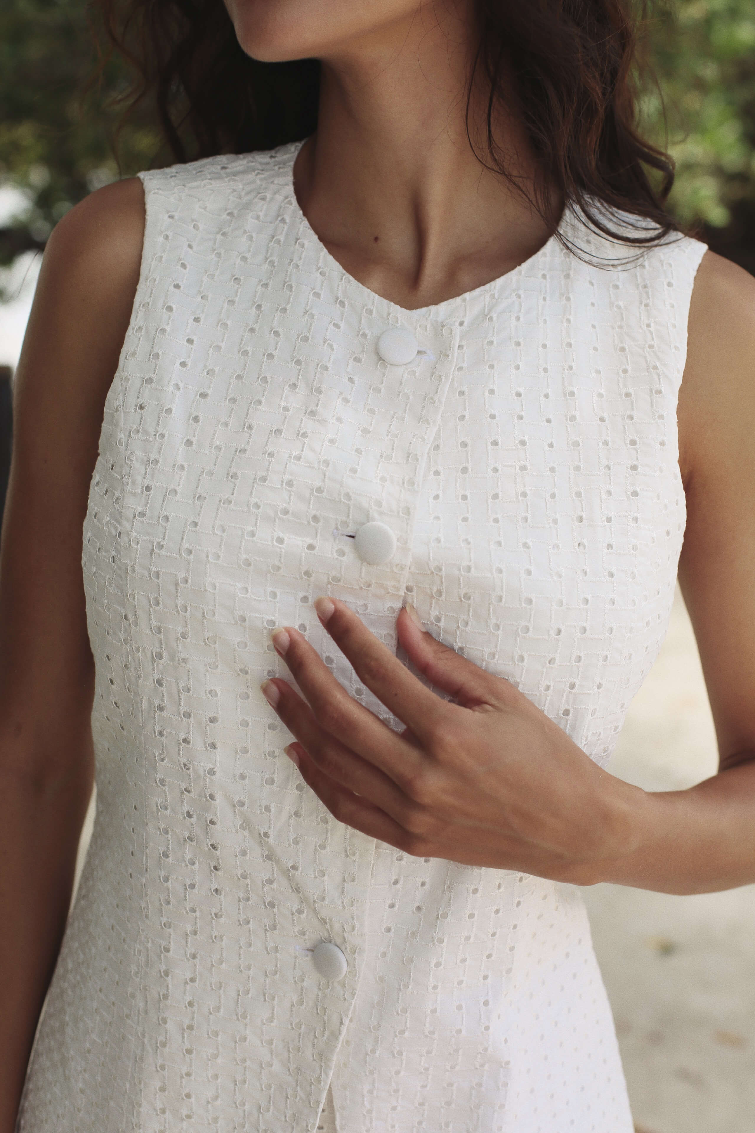 El chaleco Cristel está confeccionado en algodón bordado tipo ojalillo color ivory, que resalta por su textura delicada y aire romántico. Su diseño clásico con cuello redondo y botones forrados lo convierte en una pieza versátil para complementar cualquier look. Completamente forrado en algodón para mayor comodidad.