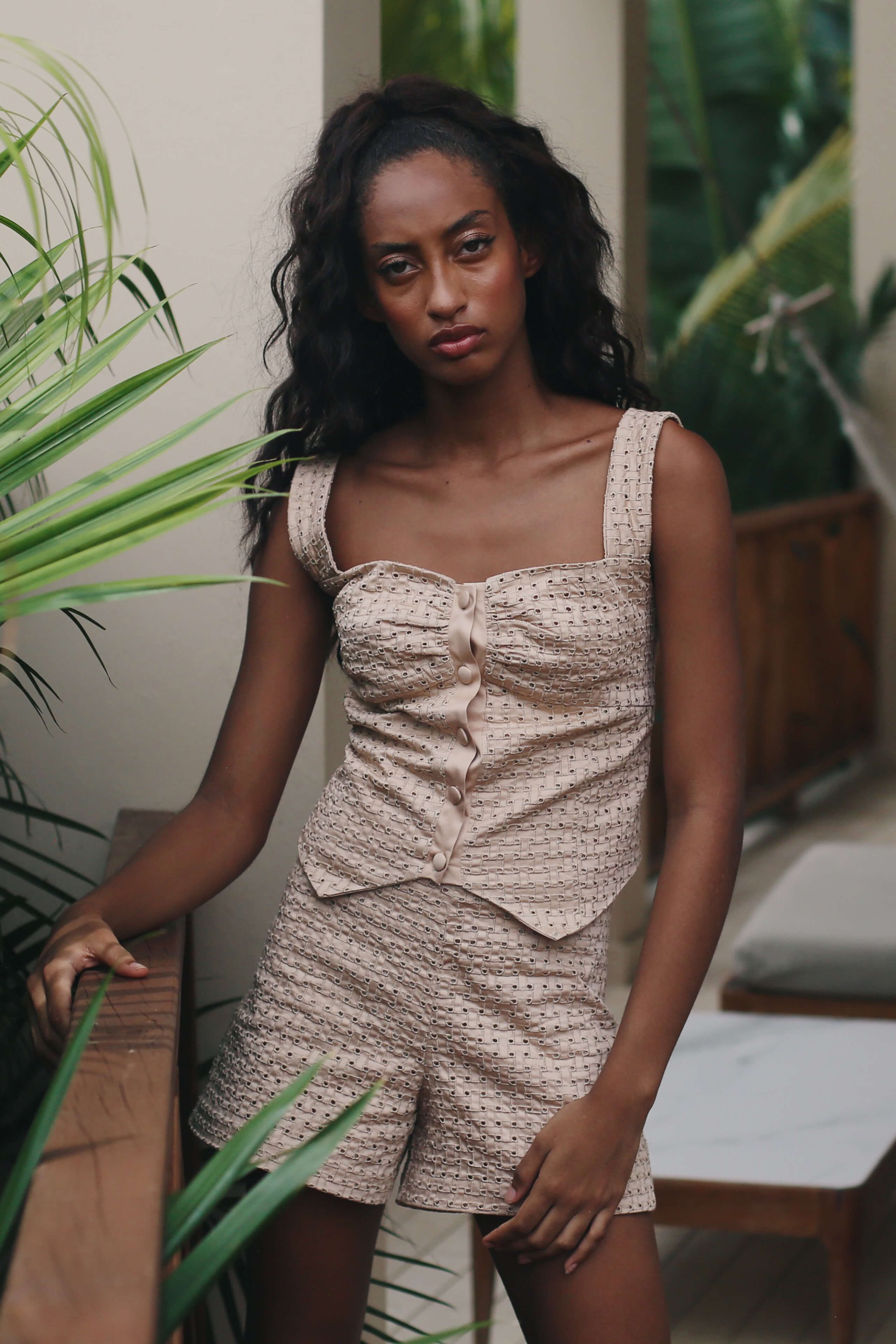 Los Shorts Flavia están hechos de algodón bordado tipo ojalillo en color arena, destacando por su cintura alta que estiliza la figura. Su corte amplio proporciona comodidad y elegancia.