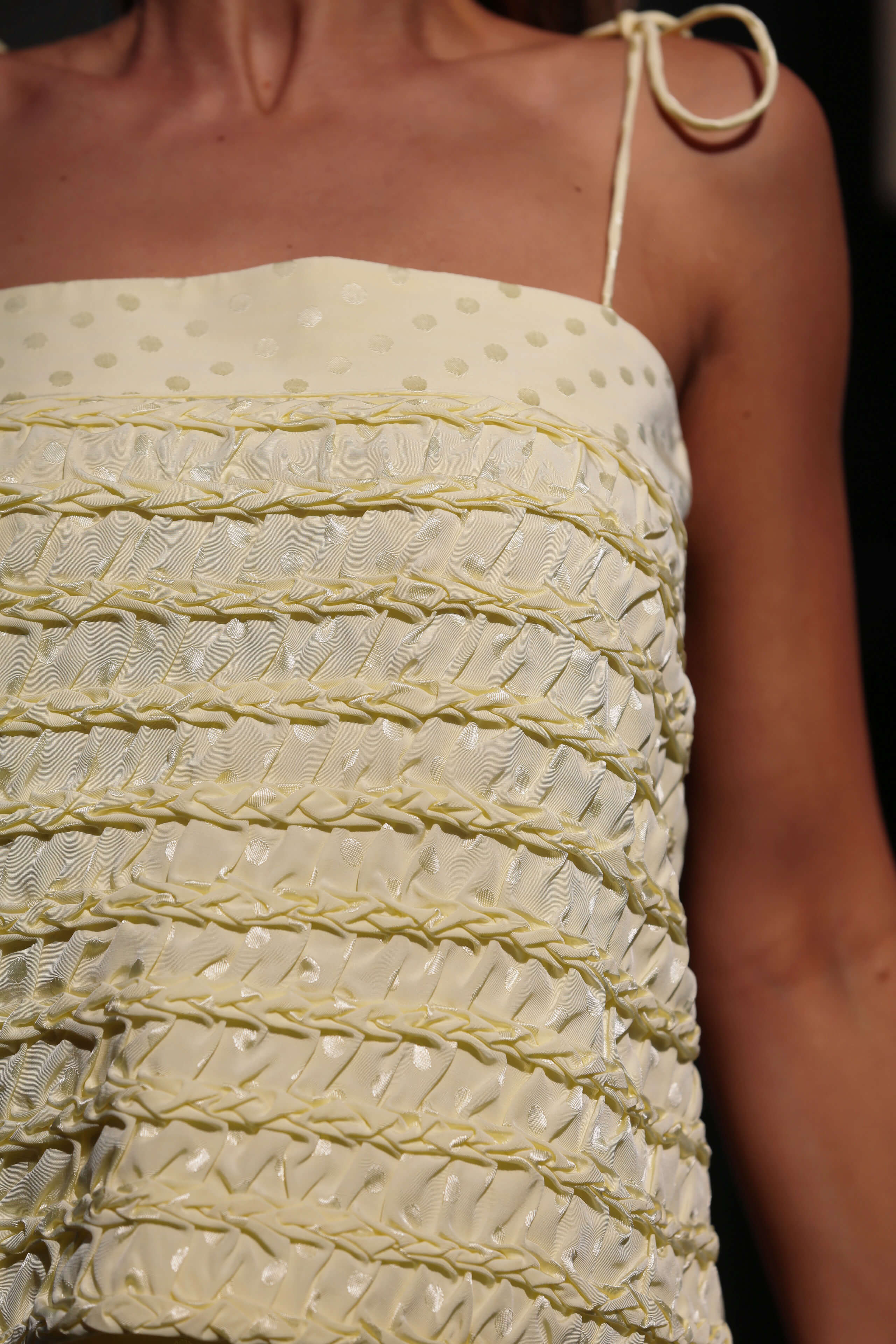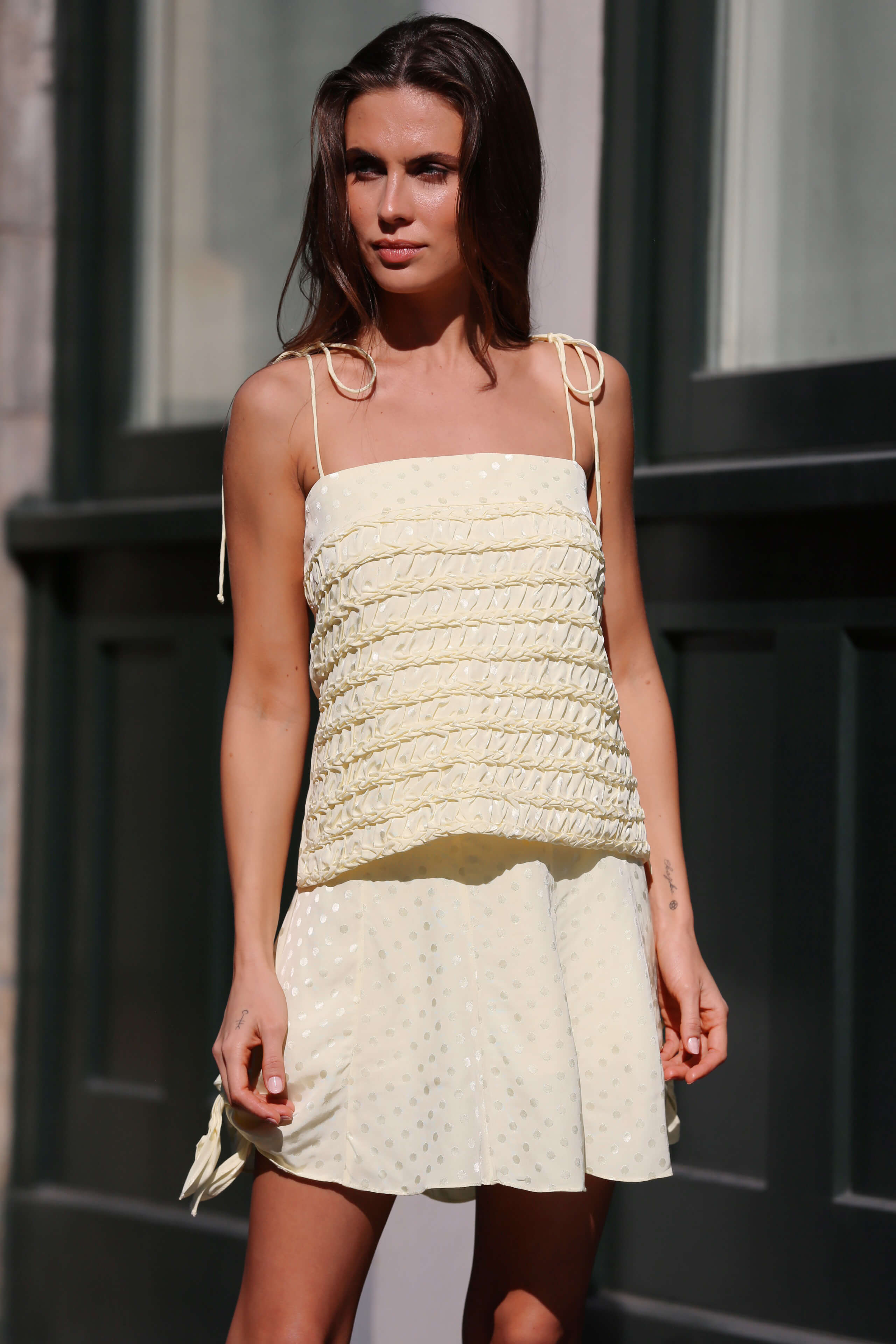El Top Xenia destaca por su textura fruncida hecha a mano en el delantero, que aporta un toque artesanal y distintivo. Confeccionado en un delicado tejido de rayón y viscosa con sutiles lunares satinados, este top combina elegancia y frescura. Los lazos ajustables en los hombros permiten personalizar el ajuste, mientras que su escote cuadrado y silueta amplia garantizan comodidad y versatilidad.